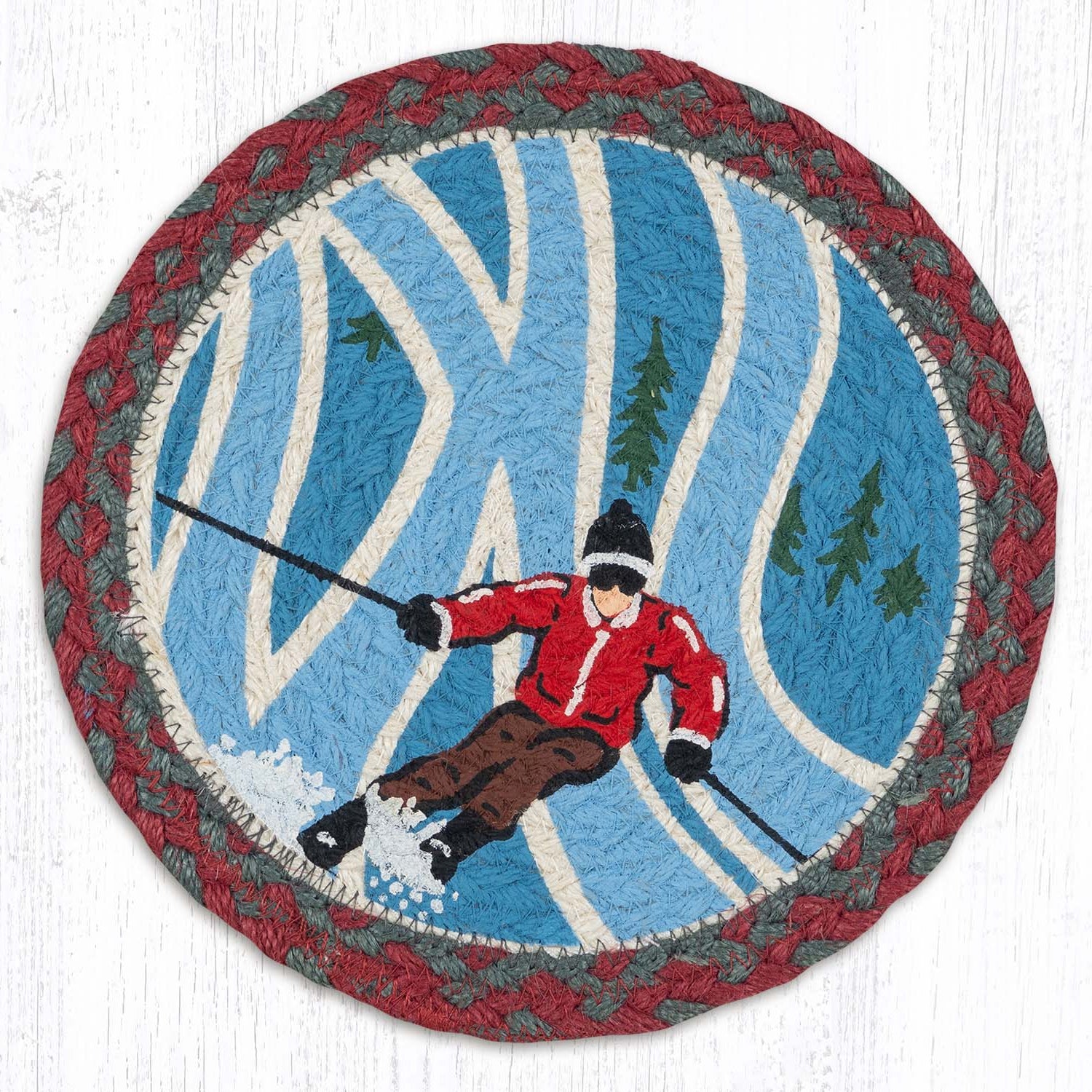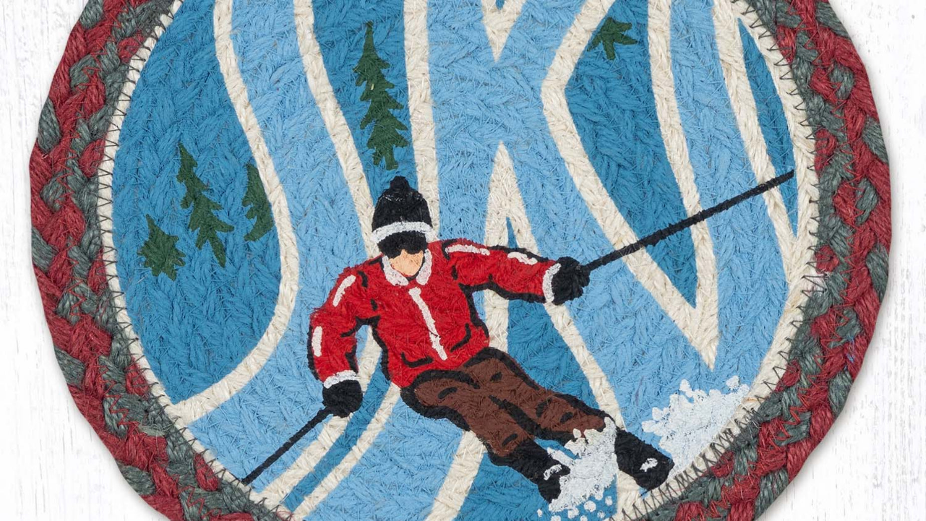 SKU - ER80-025RSJRed Ski Jacket Printed Round Trivet 10"x10" – Natural Jute Braided Rustic Holiday Table Decor