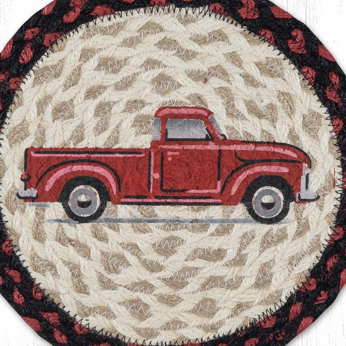 Red Truck Printed Round Trivet – 10" x 10" Braided Jute Hand-Stenciled Tabletop Accent By Earth Rugs