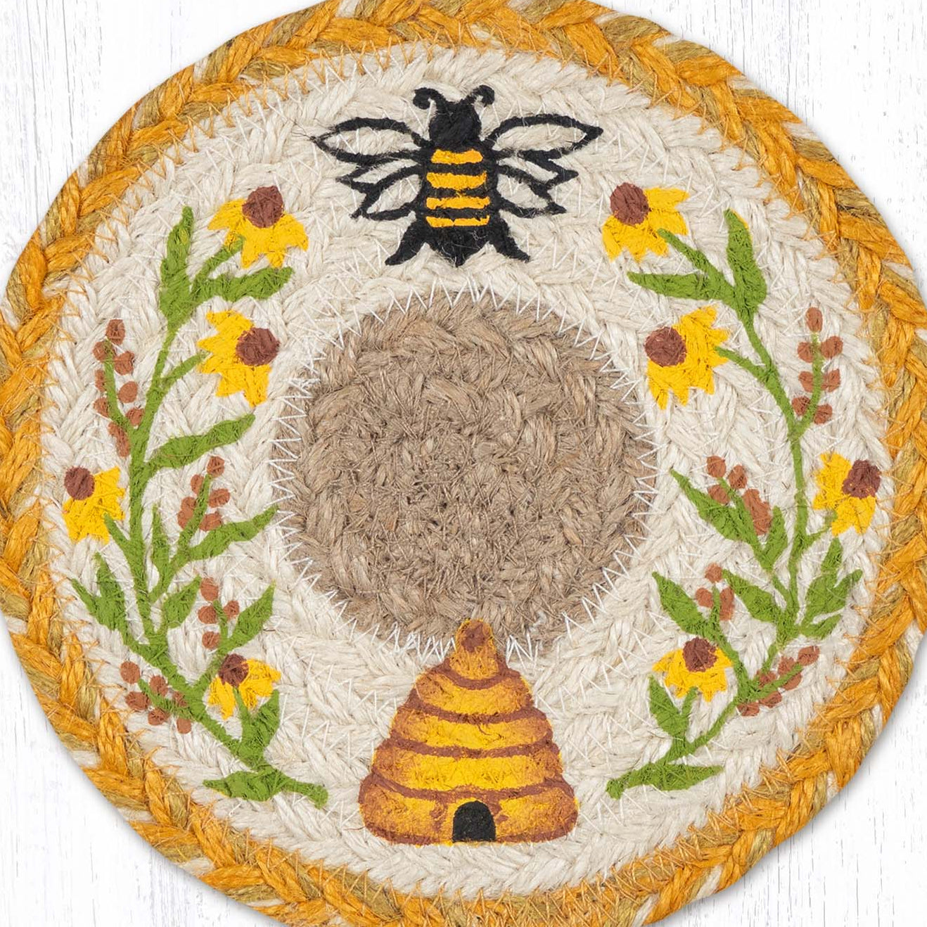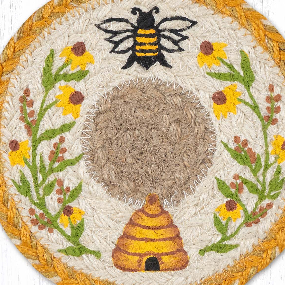 Wildflower Bees Large Coaster – 7" x 7" Round Braided Jute Hand-Stenciled Tabletop Accent By Earth Rugs