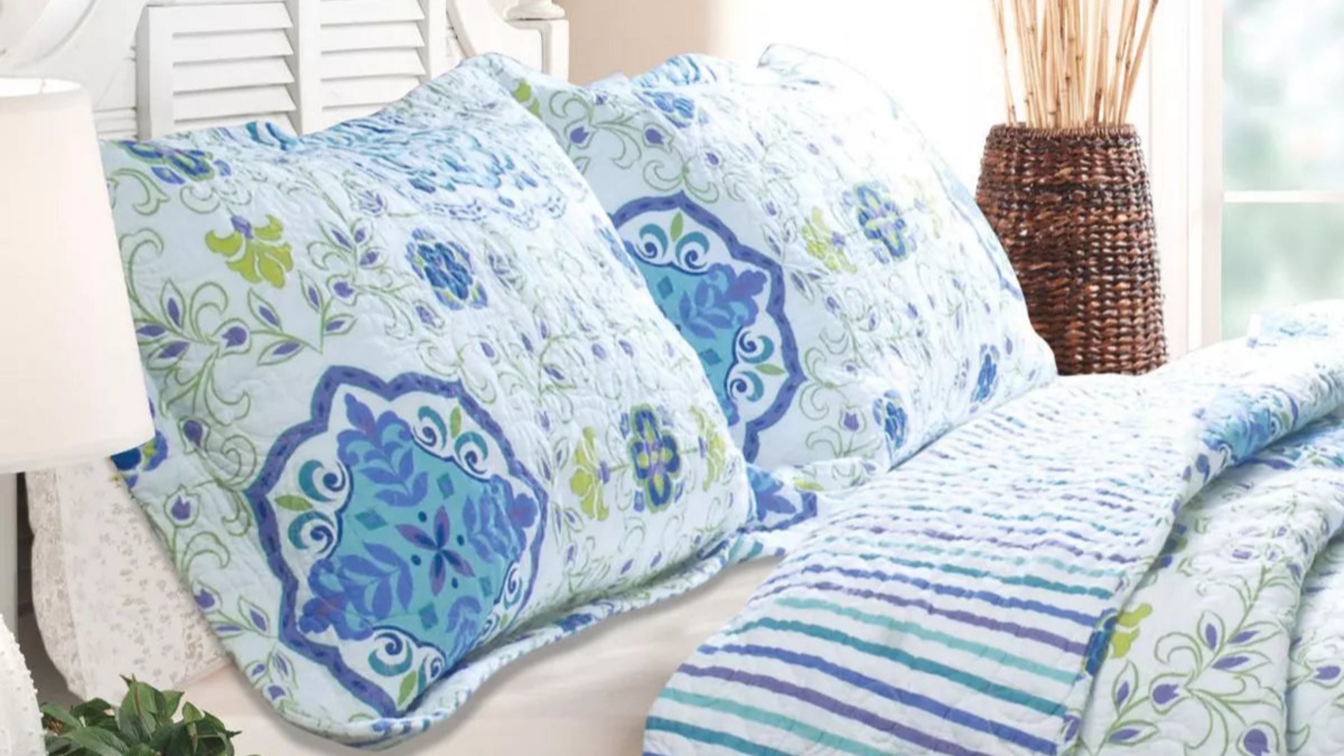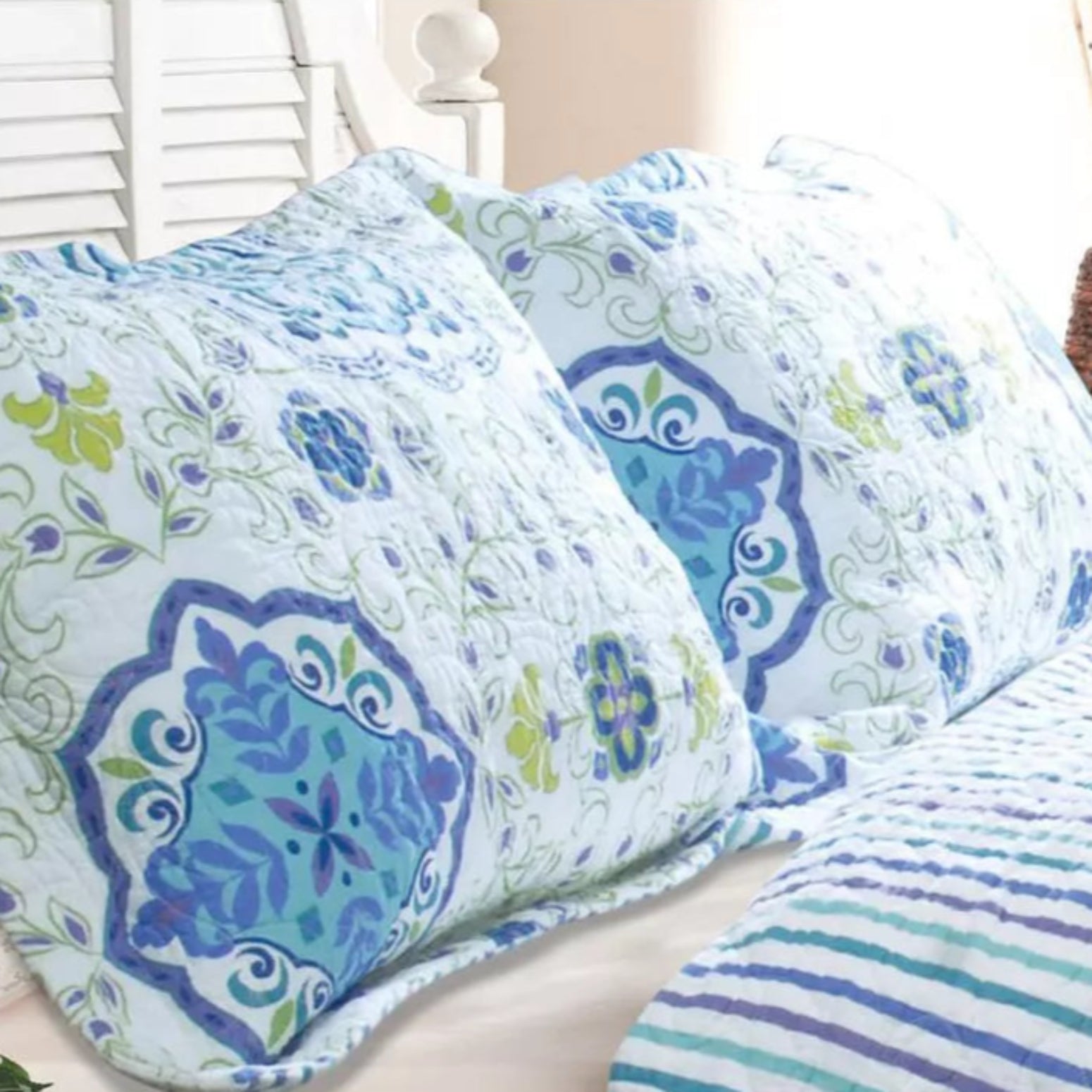 Exotic and whimsical, with motifs inspired by modern art, the Esprit style provides a perfect accent to a bohemian lifestyle. Designed to coordinate with a wide variety of interior décor themes using a varied and vibrant color palette, Esprit is perfect for any season. Quilted in a stylized daisy-chain stitch pattern, each sham reverses to a coordinating all-over stripe. Prewashed and preshrunk. Pattern: Art Deco Print. Color: Capri. All cotton face, back and fill. Dimensions: Sham: 20 inches wide x 26 inches long. King Sham: 20 inches wide x 36 inches long.
