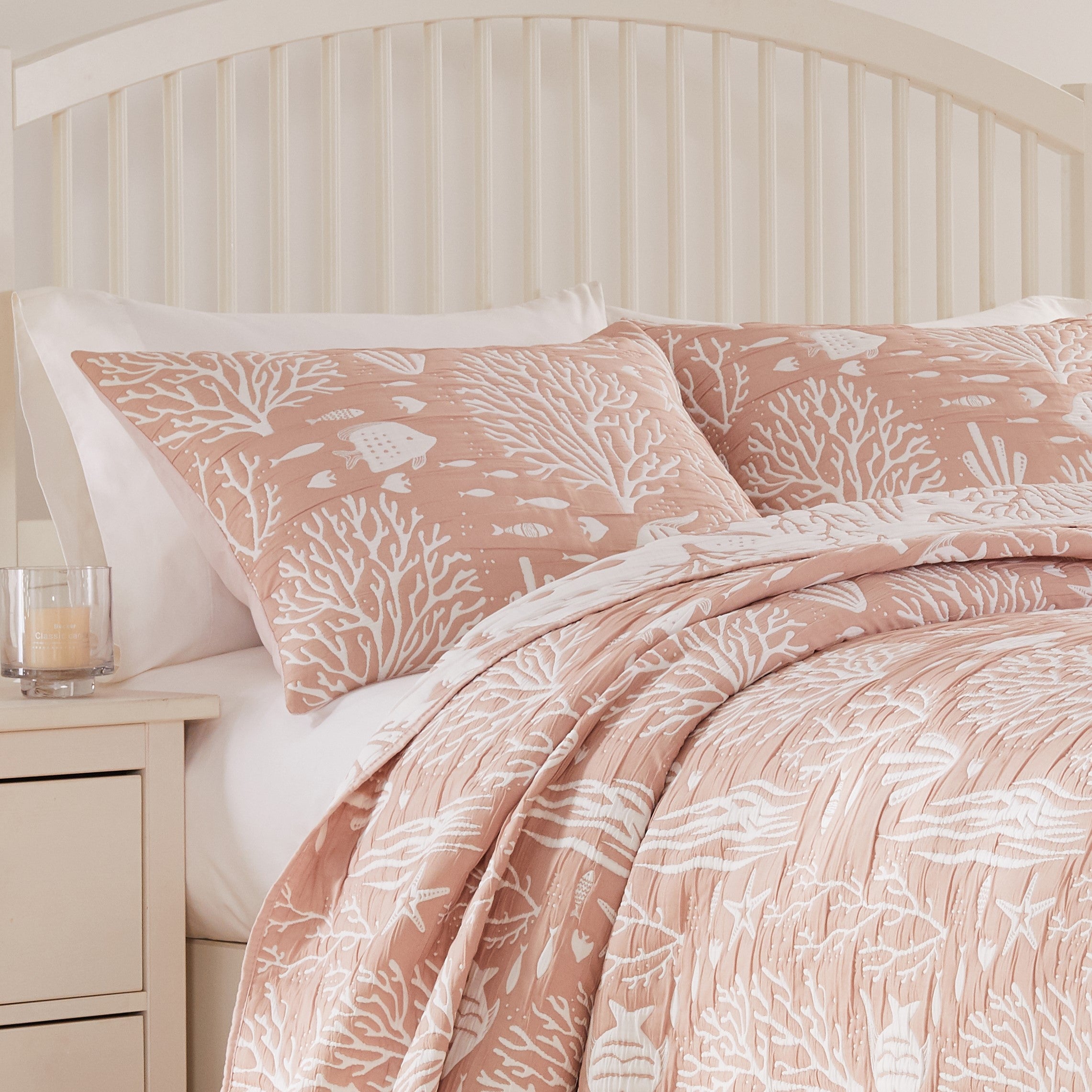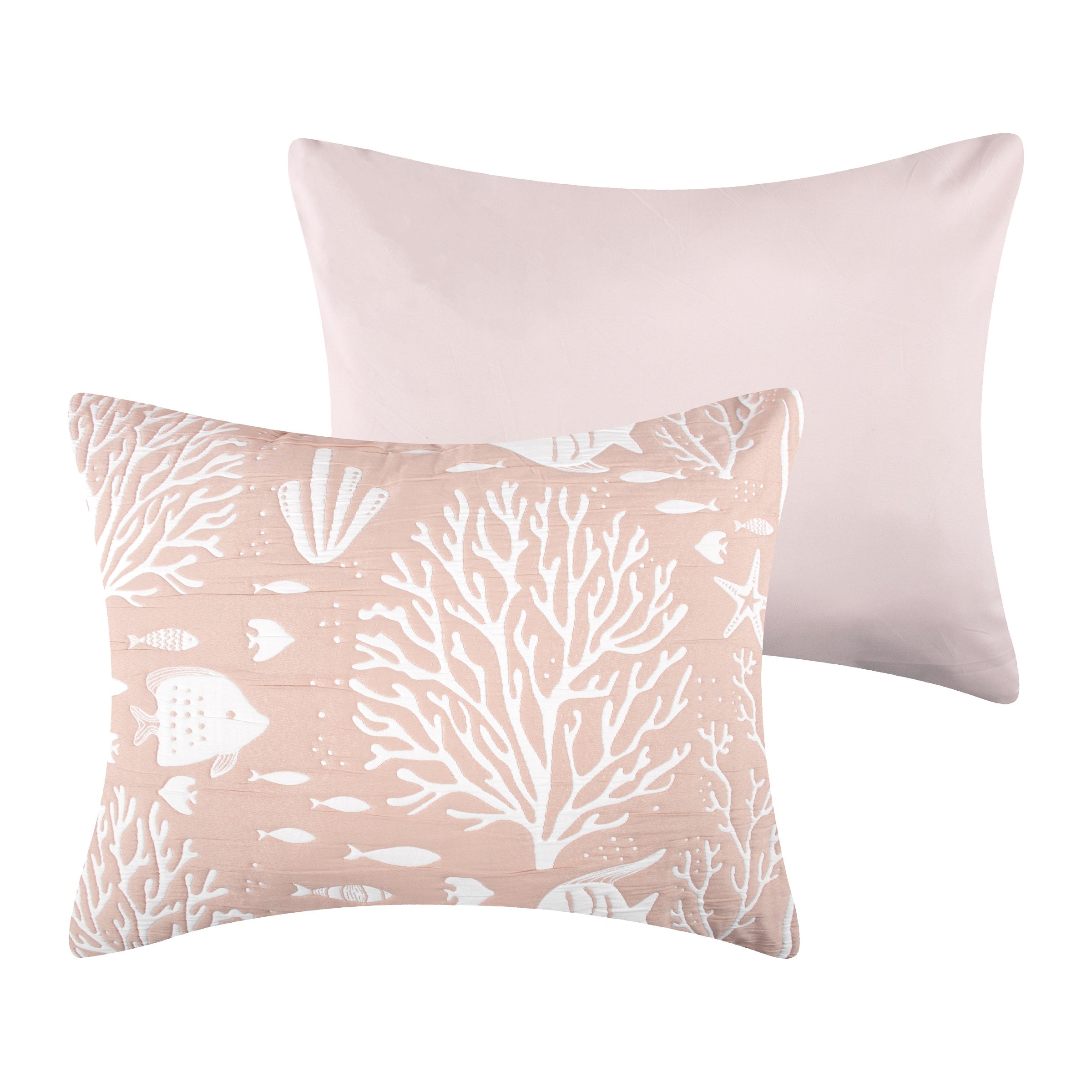 Elevate your bedroom with the Marina King Sham, a coastal-inspired woven jacquard pillow cover designed to reflect the beauty of the sea. This elegant sham showcases graceful motifs of fan corals, sea stars, and tropical fish, intricately woven into a serene blush and alabaster white palette. The reversible design allows for two distinct looks—white marine life on a soft blush ground on one side, and blush motifs on an alabaster white base on the other.