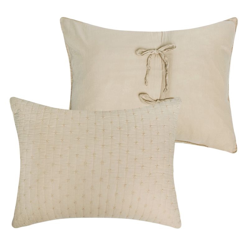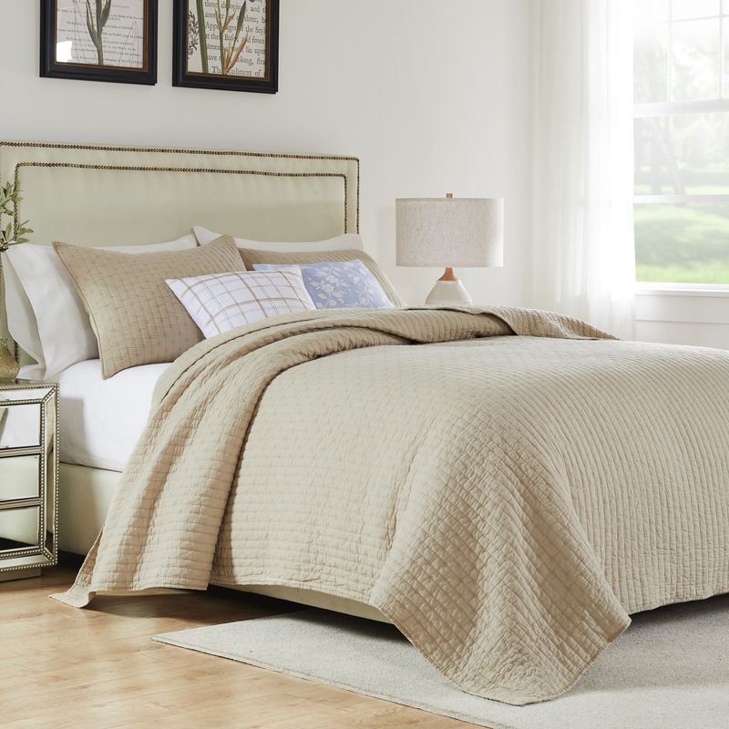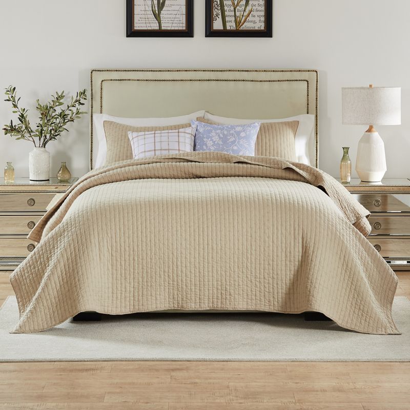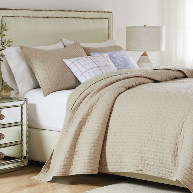 Simple elegance. Made from renewable cotton, the Monterrey quilt set combines classic solid color styling with comfort using environmentally friendly materials. Moisture-wicking cotton shell will keep you cool on warm nights and the cotton-rich fill provides the perfect balance creating a coverlet weight that is not too heavy and not too light. Channel quilting features cross stitch embellishment, adding surface texture and visual appeal. Used as a layering piece, or on top of your bed, the Monterrey quilt set looks great in any room. Set comes with quilt and two pillow shams (one sham per Twin set). Dimensions: Twin set includes one 68x88-inch quilt plus one 20x26-inch pillow sham, Full/Queen set includes one 90x90-inch quilt plus two 20x26-inch pillow shams, King set includes one 105x95-inch quilt plus two 20x36-inch pillow shams. All dimensions +/- 2 inches. Machine quilted with fabric bound edges for durability. Soft, prewashed 100% Cotton face and back; cotton rich 60% cotton, 40% polyester fill. Easy care machine washable.
