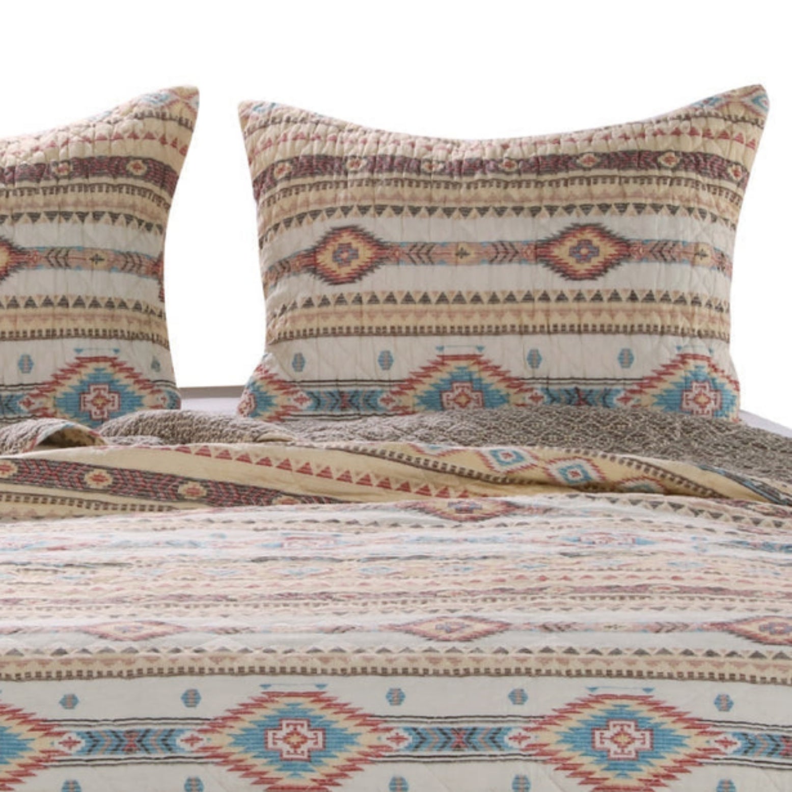 Bring timeless Southwestern patterns into your home with the Phoenix quilted pillow sham. Featuring classic geometric designs in warm, neutral tones, the Phoenix sham is the perfect accent for rustic, desert-inspired, or Western-style décor. A complementary print on the reverse side offers two looks in one, while a zippered closure makes it fully reversible. Machine quilted with fabric-bound edges for enhanced durability and texture.