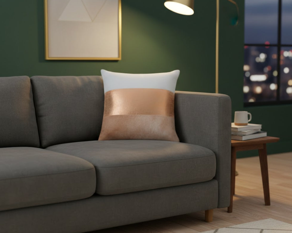 The Hide and Leather Decorative Pillow measures 22 by 22 inches and features carefully arranged bands of hide and leather that create a distinctive ombre effect. The varied textures introduce depth and visual contrast, making this pillow a statement accent for sofas, chairs, or beds. Its structured square shape allows balanced placement within layered décor arrangements. The natural material variation ensures each piece carries unique character. Designed for modern and urban-inspired interiors, this decorative pillow blends tactile texture with contemporary styling. Whether displayed individually or paired with complementary cushions, it enhances living spaces with dimension and refined detail.
