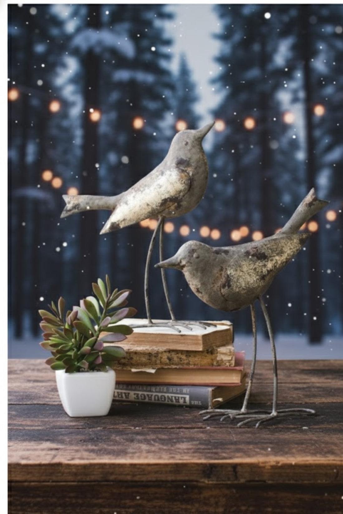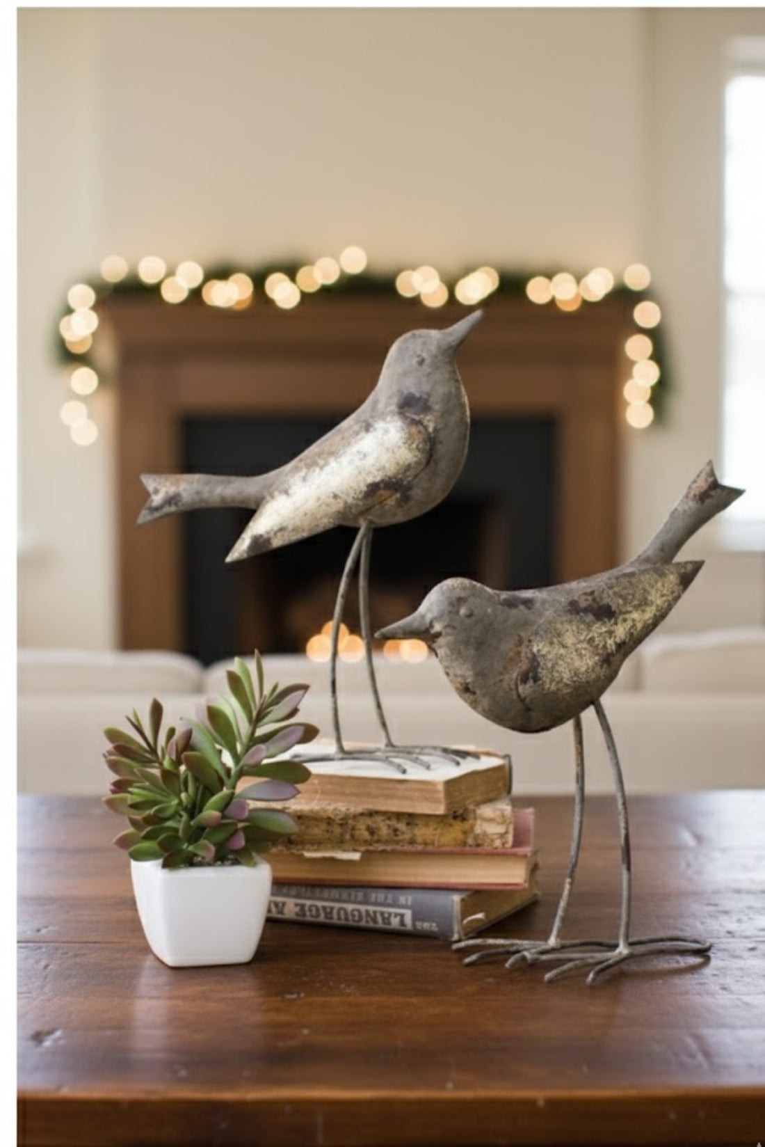 decorative bird figurines metal,distressed metal bird pair,Figuriness & Statues,grey bird sculptures for home,grey metal bird sculpture pair,metal bird figures shelf décor,metal bird figurines set of 2,Natural Noel,rustic grey metal birds set,rustic metal bird décor,tabletop metal bird décor,transitional metal bird accent