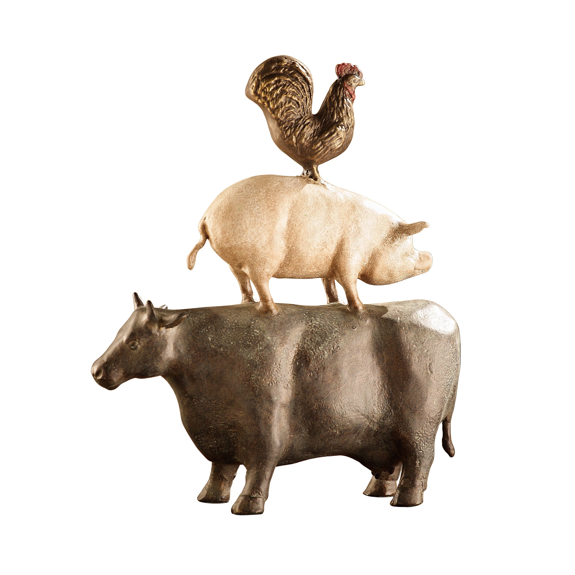 Celebrate country charm with the SPI Home American Folk Art Trio, a whimsical sculpture featuring a stacked chicken, pig, and cow. Crafted from cast metal, this rustic décor piece adds a touch of farmyard flair to any kitchen, entryway, or shelf. With a compact footprint and measuring 15" high, 13" wide, and 4" deep, it makes a delightful conversation piece in farmhouse-style interiors. Perfect for animal lovers, collectors, or anyone with a taste for Americana.