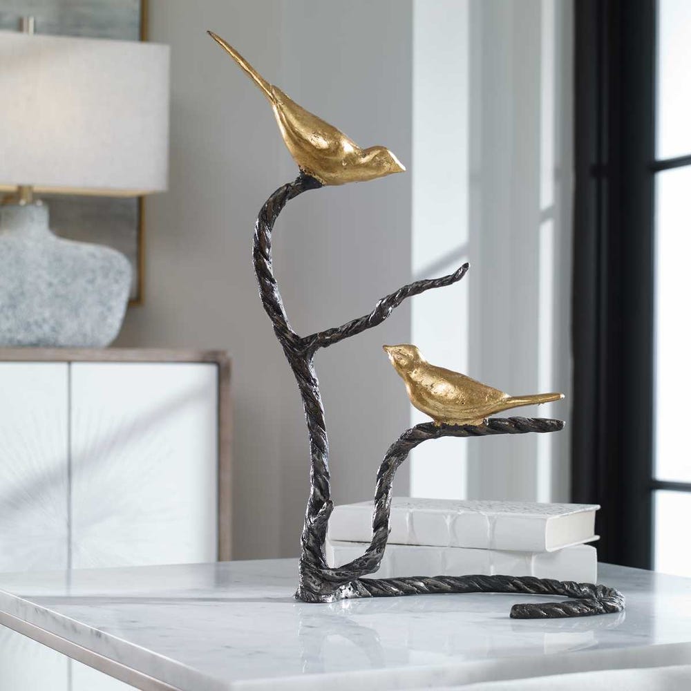Add a poetic touch of nature to your décor with the Uttermost Birds On A Limb Sculpture, an artful fusion of rustic charm and refined metallics. Designed by Matthew Williams, this striking tabletop sculpture features twisted wrought iron crafted into a branch-like form, finished in black with silver undertones, and perched with a cluster of bright, metallic gold birds.