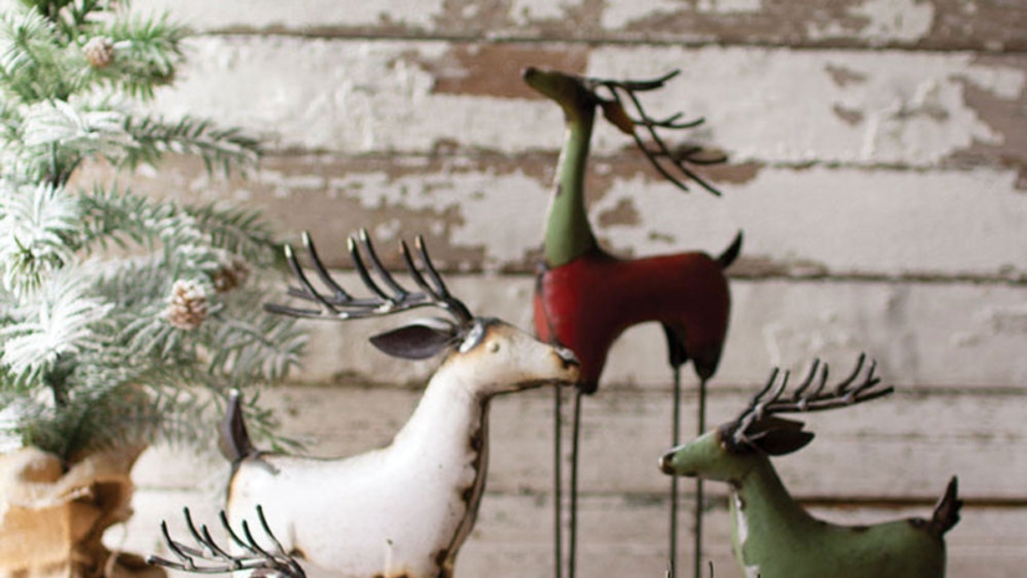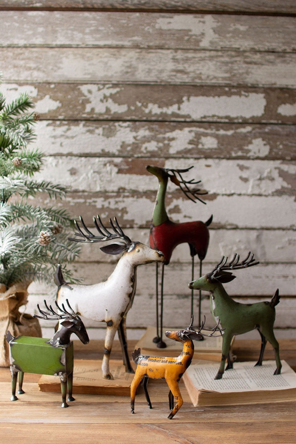 Bring a whimsical and colorful touch to your holiday decor with the Set of Five Recycled Metal Deer – One Each Design by Kalalou. Each deer is handcrafted from recycled metal and finished in festive colors, featuring a unique design and size to create visual interest in displays or centerpieces. The set includes a red deer (7" x 15"t), white deer (9.5" x 12"t), green deer (8.5" x 9.5"t), and two smaller deer in green and yellow (6.5" x 7.5"t each). Perfect for tabletops, mantels, or shelves, these Eco-friendly decorations combine sustainability with seasonal charm. Lightweight yet durable, they add playful character to holiday decor and make a delightful gift for loved ones.Dimensions:Red: 7" x 15"t White: 9.5" x 12"t Green: 8.5" x 9.5" Green: 6.5" x 7.5"t Yellow: 6.5" x 7.5"t