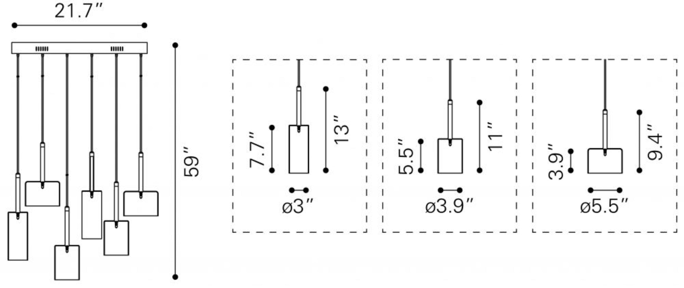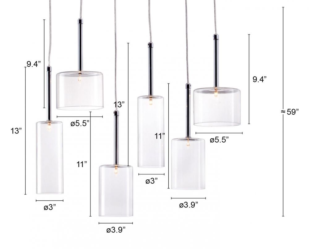 Zuo Hale Ceiling Lamp, Clear with 6 Glass Cylinders Chrome Base 13"H x 21.7"W x 5.5"D