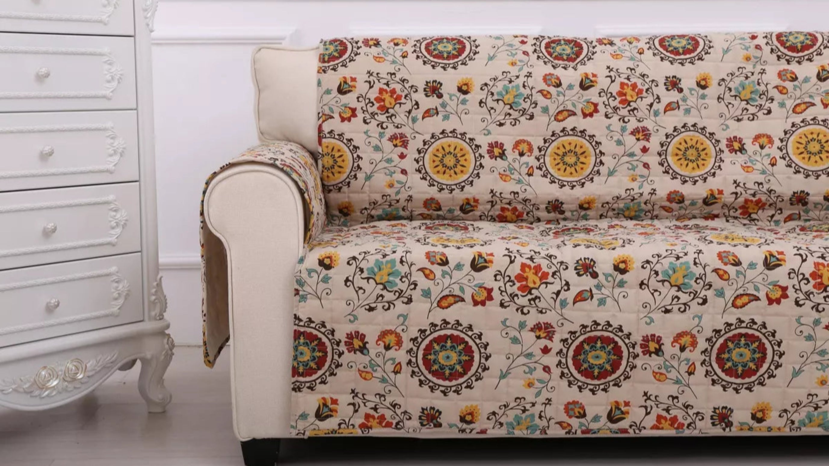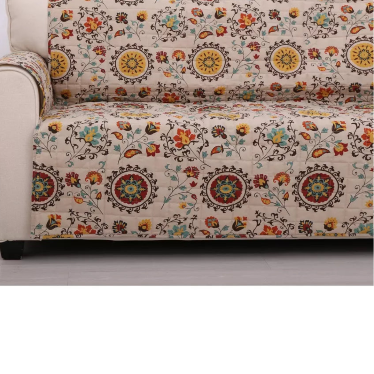 Fiery suzani sun discs and floral crests adorn this retro style furniture cover. Designed to provide decorative protection to your sofa, loveseat and armchairs, the Andorra furniture cover features decorative stitching and waterproof lining. Quilted for added loft and durability, these covers come in three sizes to guard your furniture against soil, spills, children and pets. Stabilization panels sewn to the sides and back of the reverse of each furniture protector are designed to tuck snugly into the seat cushions to hold the protector firmly in place. Generously sized to provide ample coverage on most home furniture. Dimensions: Armchair Protector back area 23`` wide x 50`` high, seat area 23`` wide x 16`` deep, front area 23`` wide x 15`` high, arm flaps 16`` wide x 29`` long (each), combined total size 84`` wide x 81`` long; Loveseat Protector back area 45`` wide x 38`` high, seat area 45`` wide x 23`` deep, front area 45`` wide x 15`` high, arm flaps 23`` wide x 29`` long (each), combined total size 103`` wide x 76`` long; Sofa Protector back area 69`` wide x 39`` high, seat area 69`` wide x 23`` deep, front area 69`` wide x 15`` high, arm flaps 23`` wide x 29`` long (each), combined total size 127`` wide x 77`` long. 100% Polyester. Machine washable.