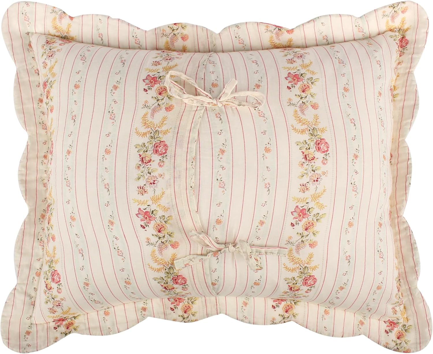 For a classic shabby chic look that will never go out of style, bring home the Antique Rose quilted pillow sham. Antique Rose, by Greenland Home Fashions, combines traditional and Victorian sensibilities with the comfort of renewable 100% cotton fibers. Featuring authentic patchwork construction, pieced, and assembled from a floral print and a pinstripe print with dainty scrolling floral embellishments, Antique Rose adds grace, charm, and beauty to any home. Finely stitched for durability with scalloped edges along its borders, Antique Rose reverses to a traditional pinstripe whole cloth print. These pillow shams feature cloth ties on either side of an envelope opening in the back to hold your pillow in place within each sham. Prewashed and preshrunk. Machine washable. Dimensions: Standard sham measures 20x26 inches; King sham measures 20x36 inches. All dimensions +/- 1 inch. 100% Cotton.