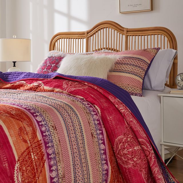 Brighten your Boho. Aurora quilt sets combine paisleys, stripes and medallions in a vintage look that inspires your creative spirit. Quilt and sham(s) reverse to a rich coordinate solid color. Oversized for better coverage on today’s deeper mattresses. Machine quilted with fabric bound edges for durability and surface interest. Quilt set comes with quilt and two pillow shams (one sham per Twin set). Dimensions: Twin set includes one 68x88-inch quilt plus one 20x26-inch pillow sham, Full/Queen set includes one 90x90-inch quilt plus two 20x26-inch pillow shams, King set includes one 105x95-inch quilt plus two 20x36-inch pillow shams. Dimensions +/- 2 inches. Machine Wash. 100% Microfiber polyester shell with 100% polyester fill. Imported.