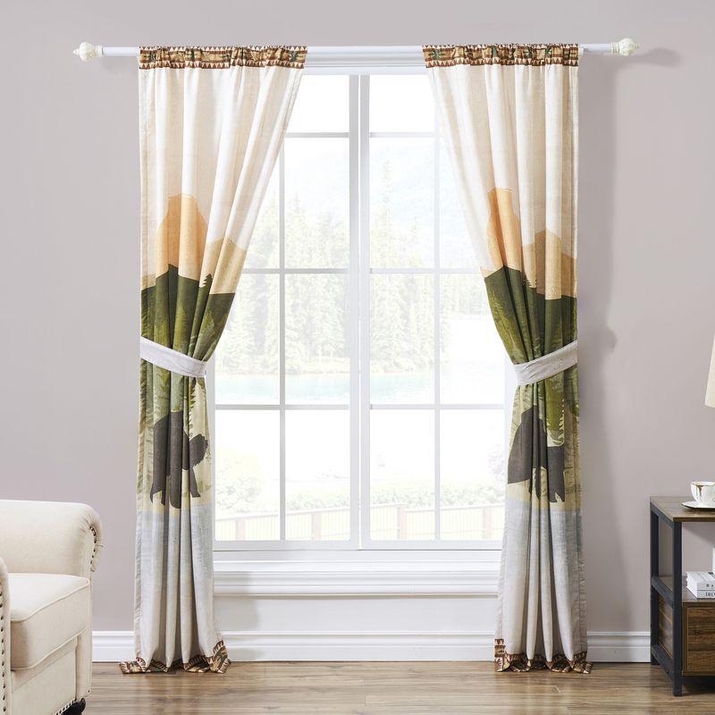 Infuse your space with rustic charm and mountain-inspired tranquility using the By the Lake Window Curtain Panel Pair. Showcasing a majestic bear roaming beneath forested peaks and bordered with motifs, this curtain set perfectly complements Western, Lodge, or Lakehouse interiors. Ideal for bedrooms, living rooms, or cozy dens, it adds a touch of wilderness elegance to your home.