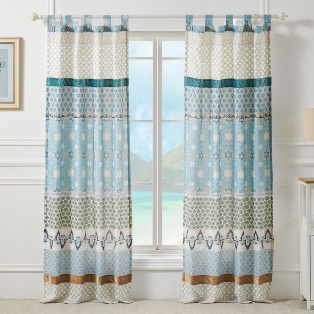 Rows of vivid geometric, foulard and floral prints create distinctive bohemian styling. The Thalia panel set features the latest fashion colors and multi-fabric construction embellished with velvet bands. This multi-fabric construction panel pair is perfect for any window. 95% Cotton, 5% polyester face, 100% cotton back (2 ply). Tab tops for up to 3" rod for hanging. Dimensions: Approx. 84" long x 42" wide each panel, including 3" tab top. Machine washable. This 4-Piece set includes two panels and two tie backs. Button embellishments on tabs add charm and character.