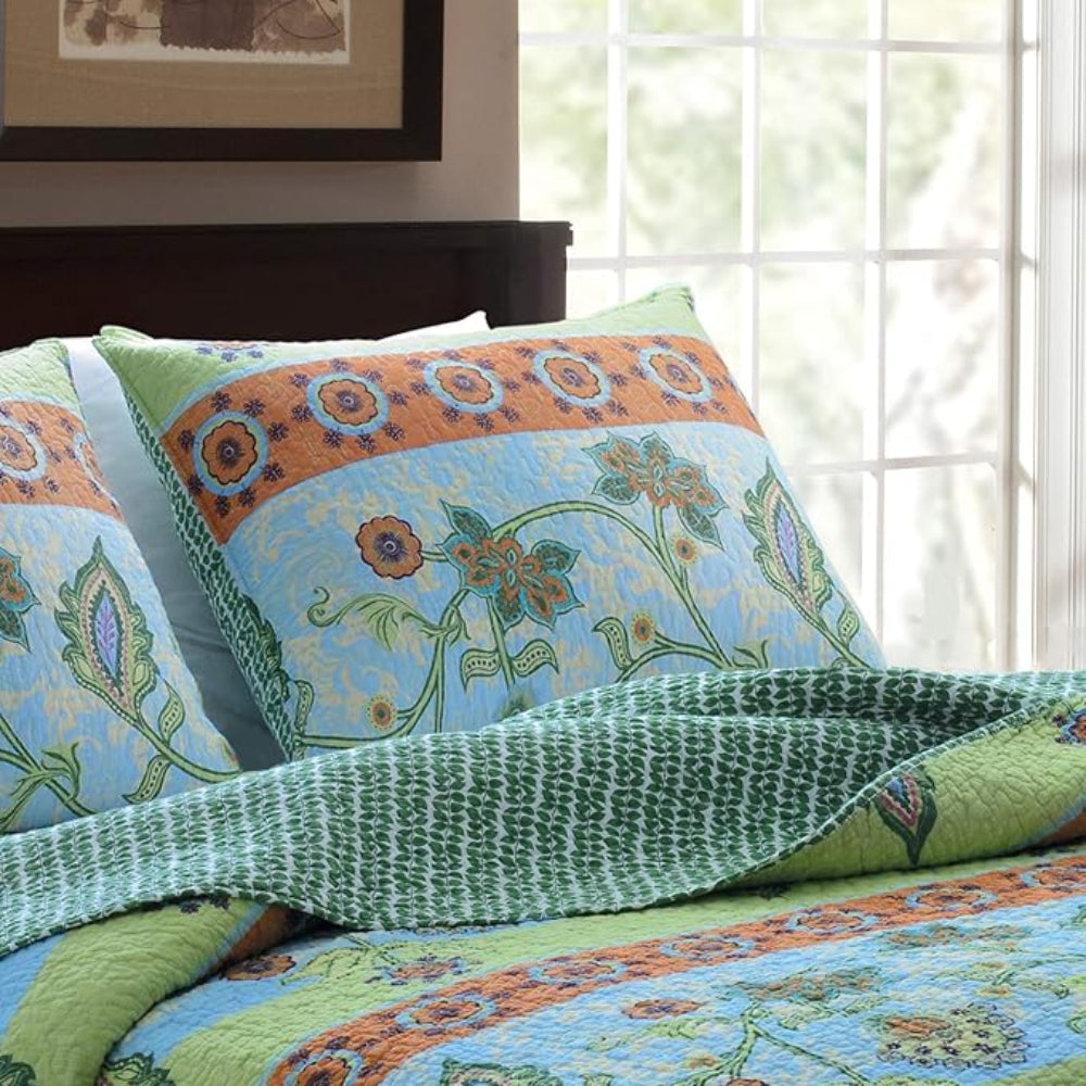 Infuse your bedroom with organic elegance using the Mara Pillow Sham from Greenland Home Fashions. Designed to complement the Mara quilt collection, this sham features meandering vines, orange blossoms, and blue-green leaves, arranged in a botanical-inspired pattern. The reverse reveals a rich leaf print, giving you two nature-inspired looks in one. Crafted from 100% cotton face and back with 100% cotton fill, the sham is prewashed and preshrunk for softness and long-lasting performance. Machine quilted with fabric-bound edges, it offers texture, structure, and refined detailing. Available in standard (20" x 26") and king (20" x 36") sizes to suit your bedding needs.