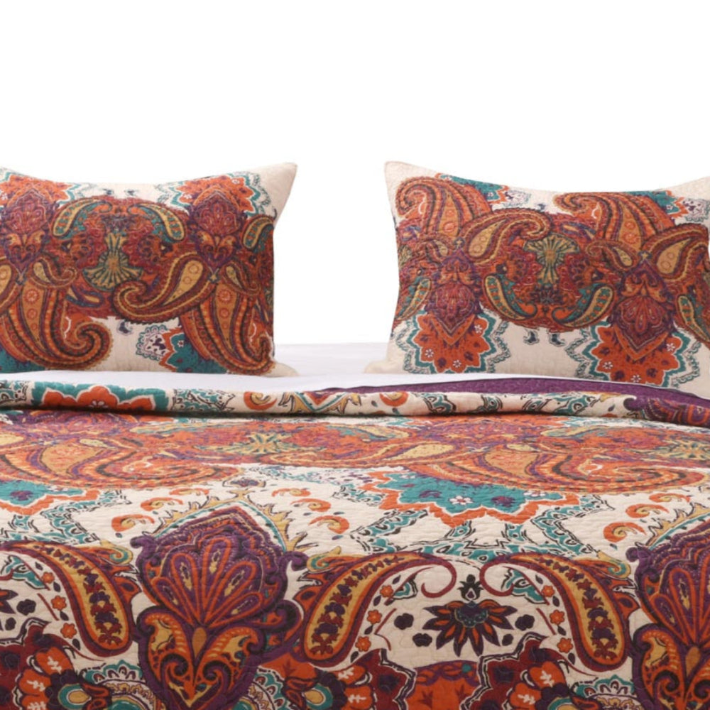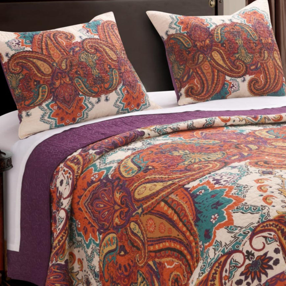 Inspired by Eastern art and the bold, retro color palettes of the 1960’s, the Nirvana bedding adds dramatic style to your space. Reversing to a deep saturated solid purple, Nivana Spice adds an hip, bohemian vibe to your bed. Prewashed and preshrunk 100% cotton face and back with 100% cotton fill. Machine quilted for durability and surface interest. Machine washable. Dimensions: 20x36``.