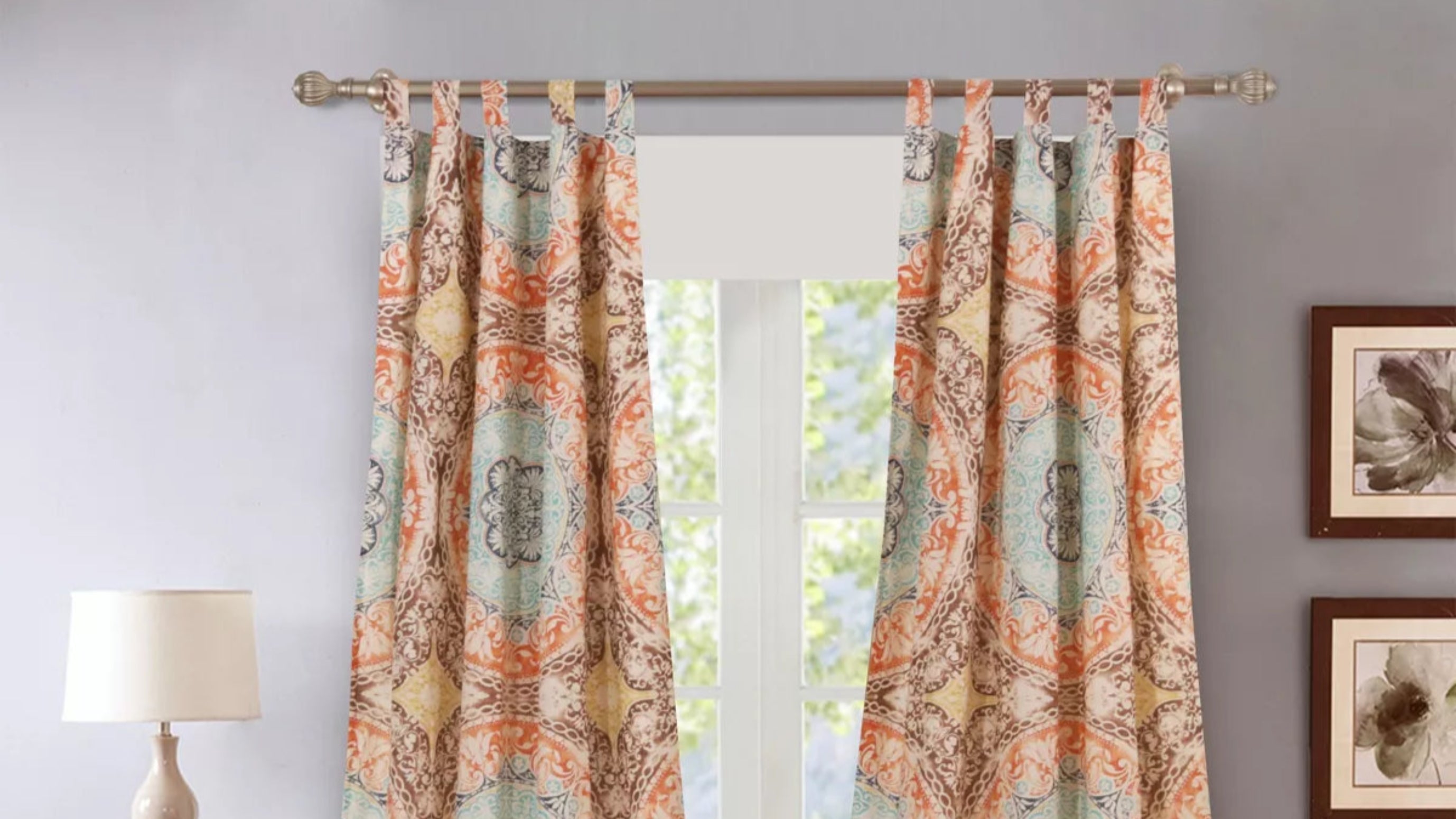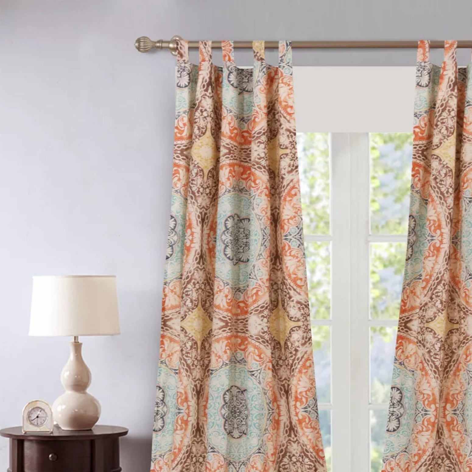 The Olympia curtain panels` earth tone medallions recall the grandeur of sun-drenched Mediterranean kingdoms. Enter a dreamy labyrinth and dance with your inner Minotaur. Featuring turquoise, indigo, coffee bean, sienna, and mimosa on a papyrus ground, each 4-piece curtain panel pair set comes with two 42`` wide x 84`` long panels, plus two tiebacks. Overall dimensions 84x84``. Lined for increased privacy and sun protection. 100% Microfiber polyester. Machine Wash.