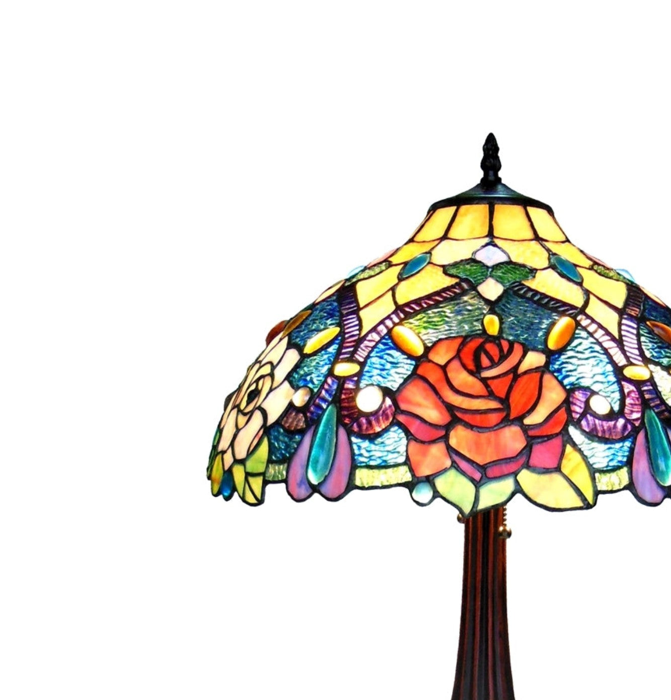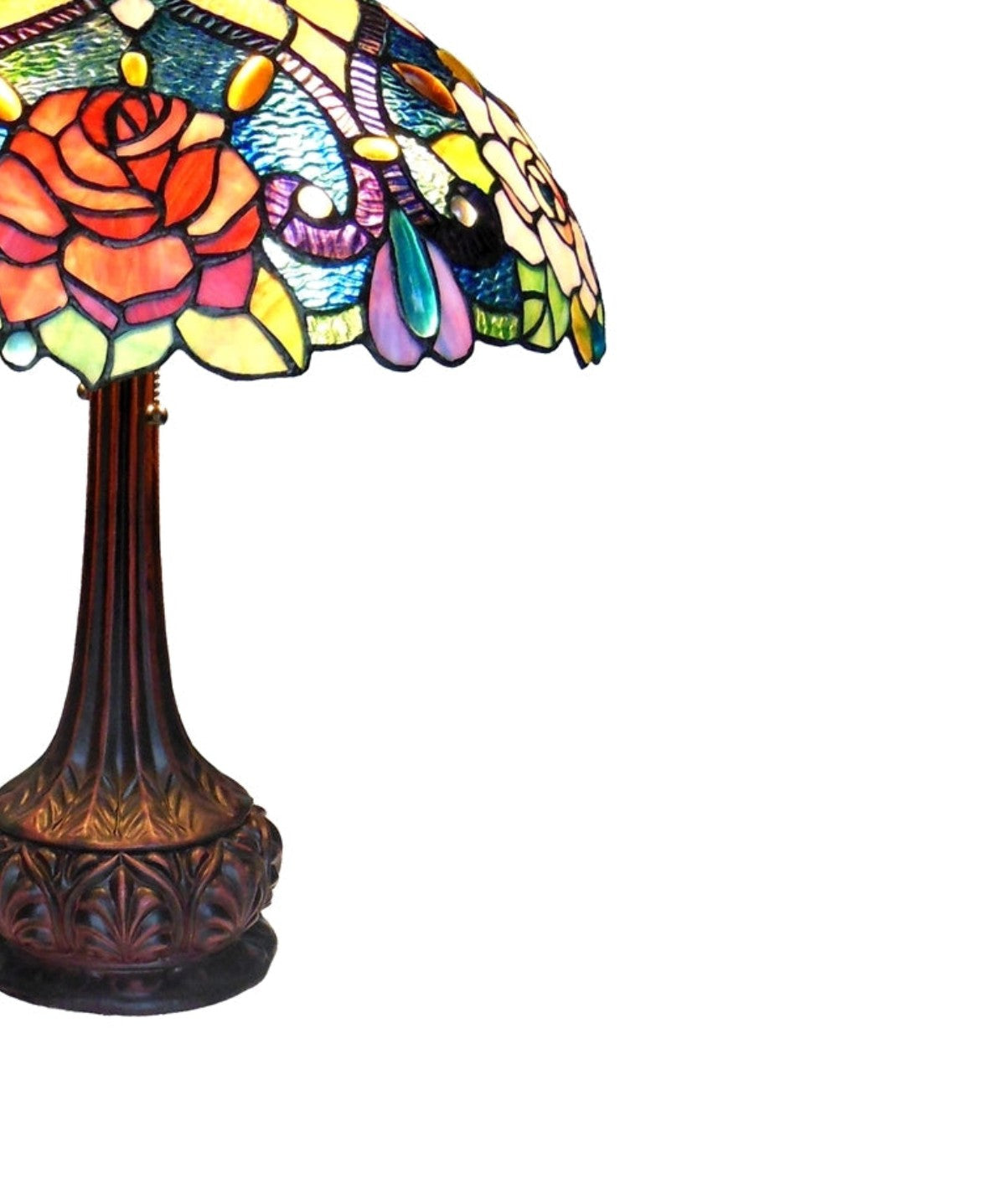 - Lush rose-themed Tiffany-style design with vibrant colored glass