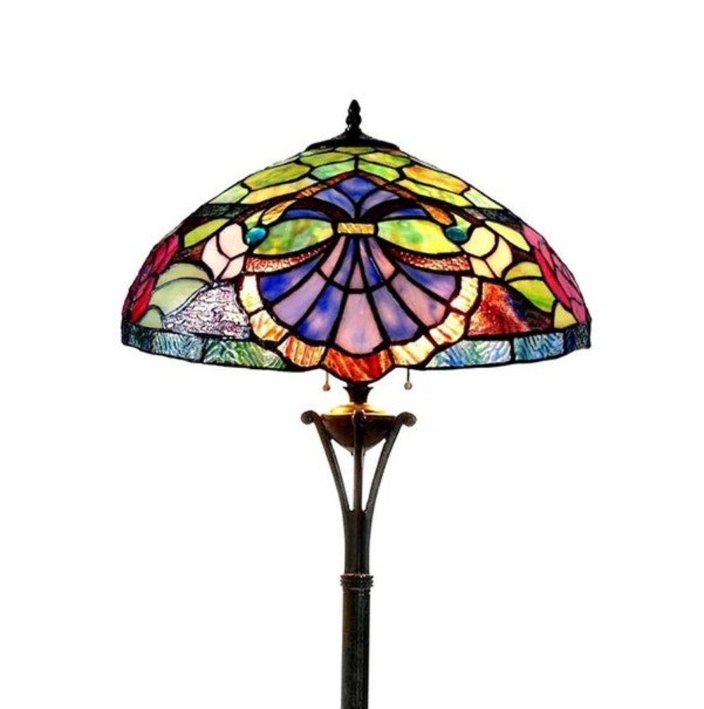 This Tiffany-style Baroque and floral roses design 2-light floor lamp features an antique bronze finish that will complement many decors throughout your home. Hand crafted from individually hand cut of 400 pieces copper-foiled stained glass and 6 beads that will add color and beauty to any space. Main colors are blue, green, and red.