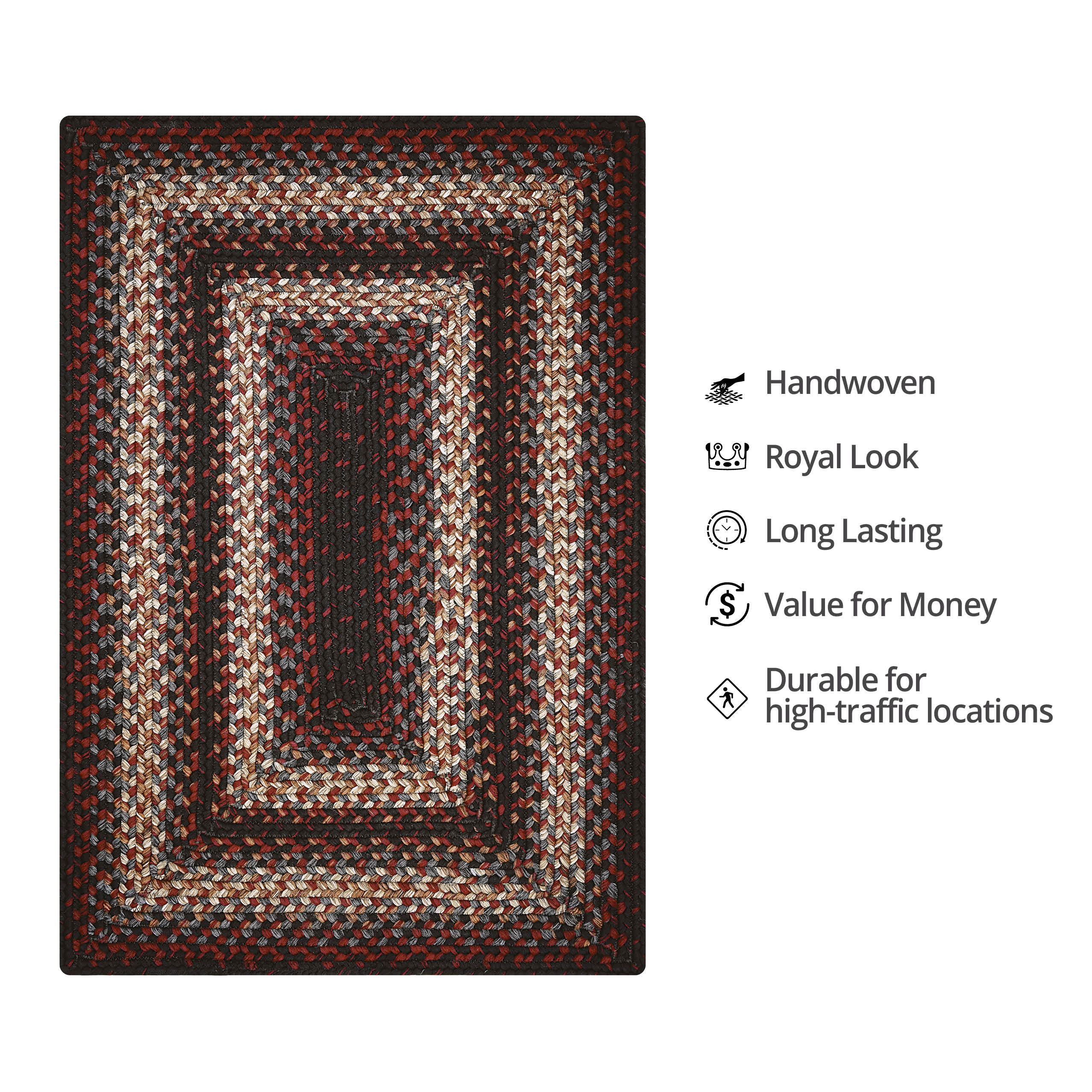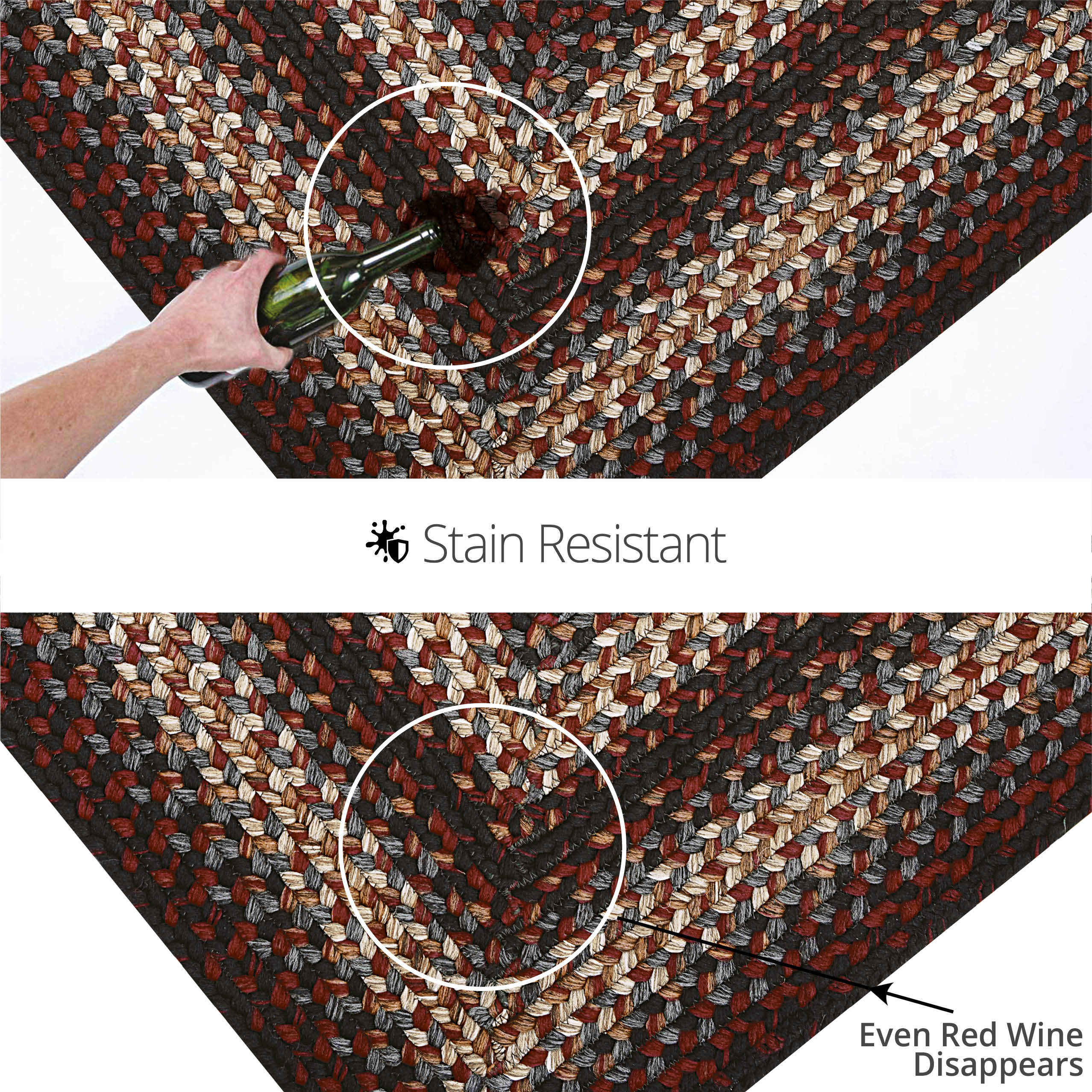 - MONTGOMERY ULTRA DURABLE BRAIDED RUG: Montgomery is a stunning combination of black, burgundy, grey, brown, and cream. Treated for superior UV resistance for use under direct sunlight