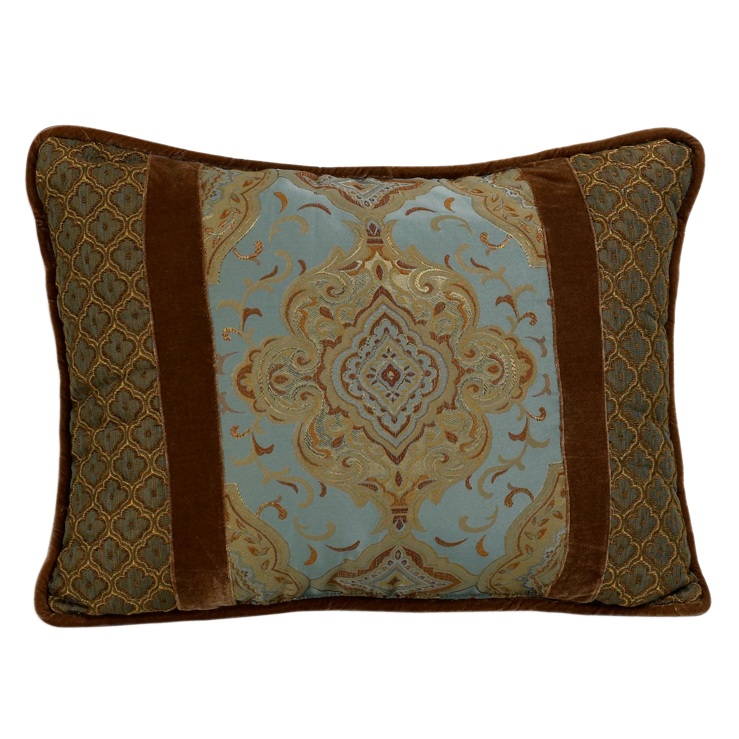 The Bianca decorative toss pillow features a middle panel of light blue coordinating medallion fabric and a panel of small geometric fabric on both sides.