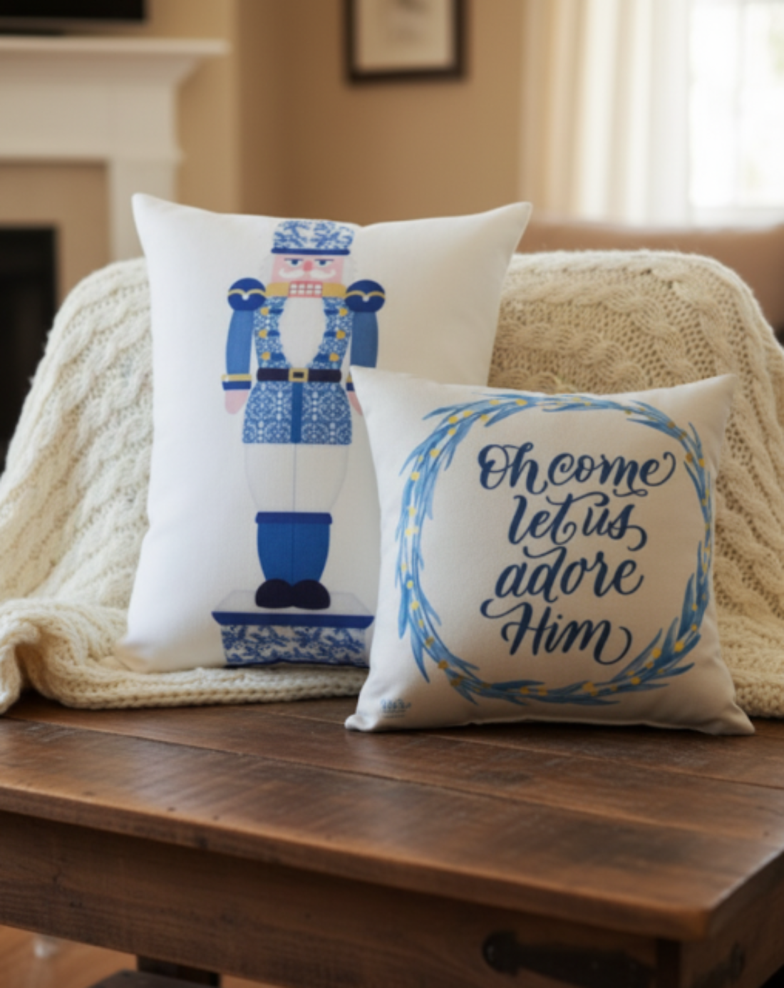 SKU - MWWSDBWCChristmas Accent Pillow – Blue & White Faith-Themed Climaweave 12x12