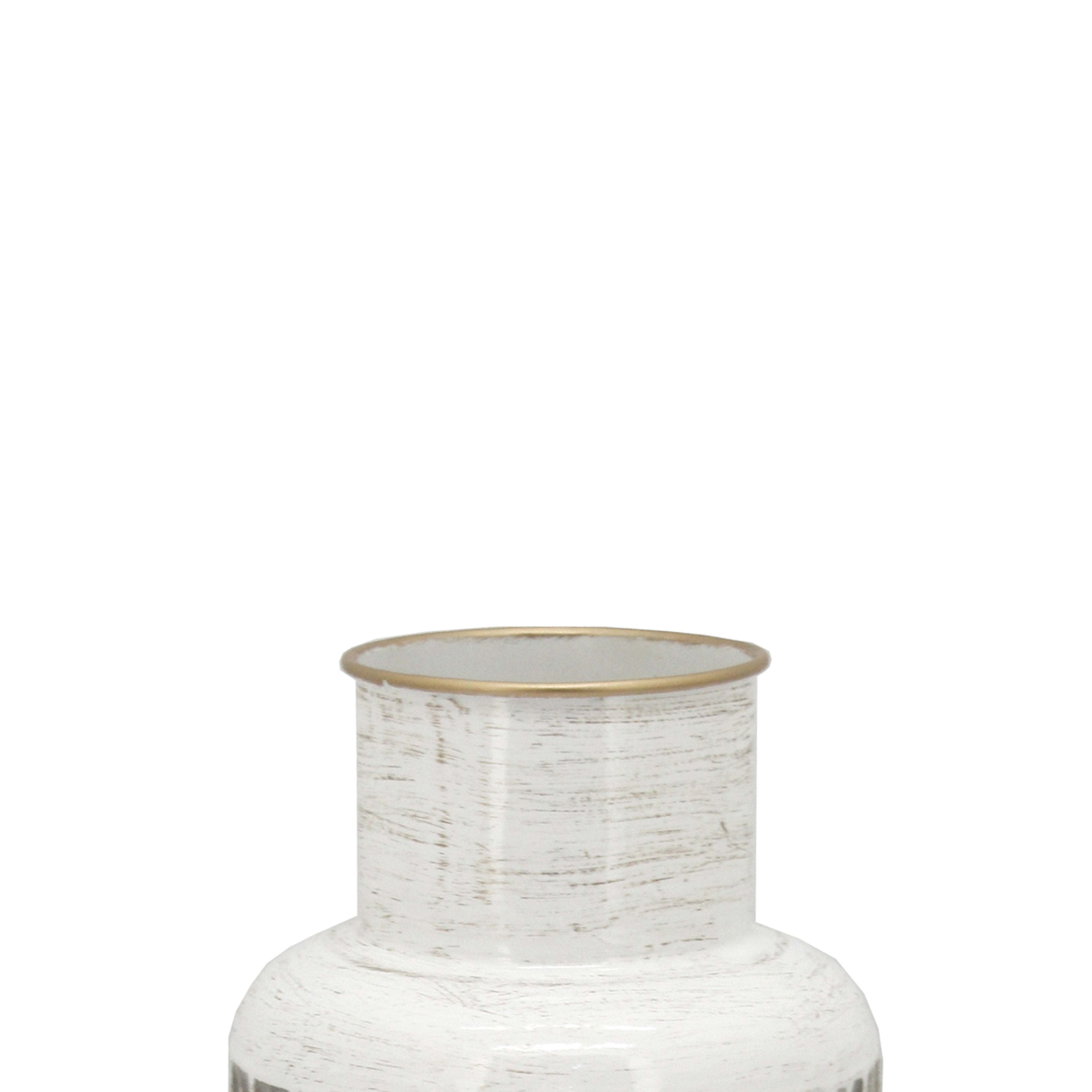 Bring home this metal constructed accent decor to add a tint of rustic charm. The milk jar design with golden colored rimmed top and narrow neck completes its look. The textured lines on the surface adds to its look and makes it an ideal addition to your home.
