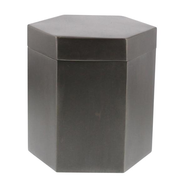 Complement your tabletopdecor setting by bringing in this industrial style inspired Cannister which comes in a hexagonal shape. Crafted from metal frame with lidded closure, it is accented with antique bronze finish.
