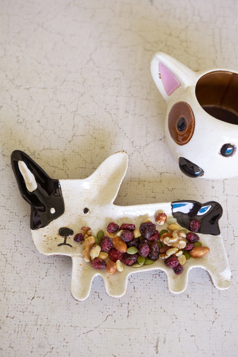 Dog-shaped ceramic dish filled with dried fruits on a woven mat