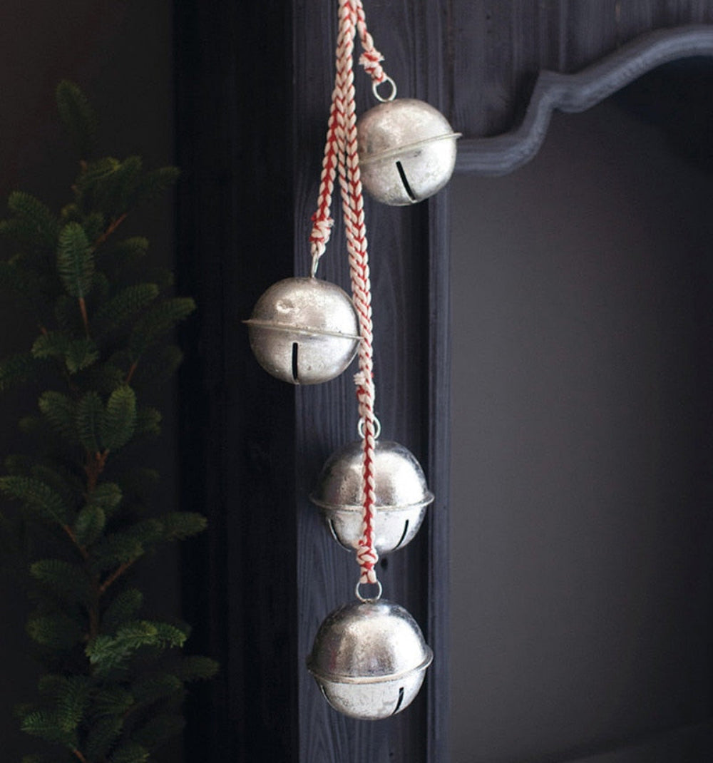 Bring the joyful sound of the holidays to your home with this Silver Jingle Bell Cluster. Crafted from durable metal and suspended by a sturdy cotton rope, this 29-inch decoration adds a festive accent to doors, mantels, or entryways. The distressed silver finish gives it a rustic, vintage charm that complements both modern and traditional Christmas décor. Each cluster features four bells that chime softly when moved, creating a warm and welcoming atmosphere. Perfect for adding a touch of sparkle and sound to your seasonal celebrations, this timeless decoration can be easily wiped clean with a lint-free, dry cloth.