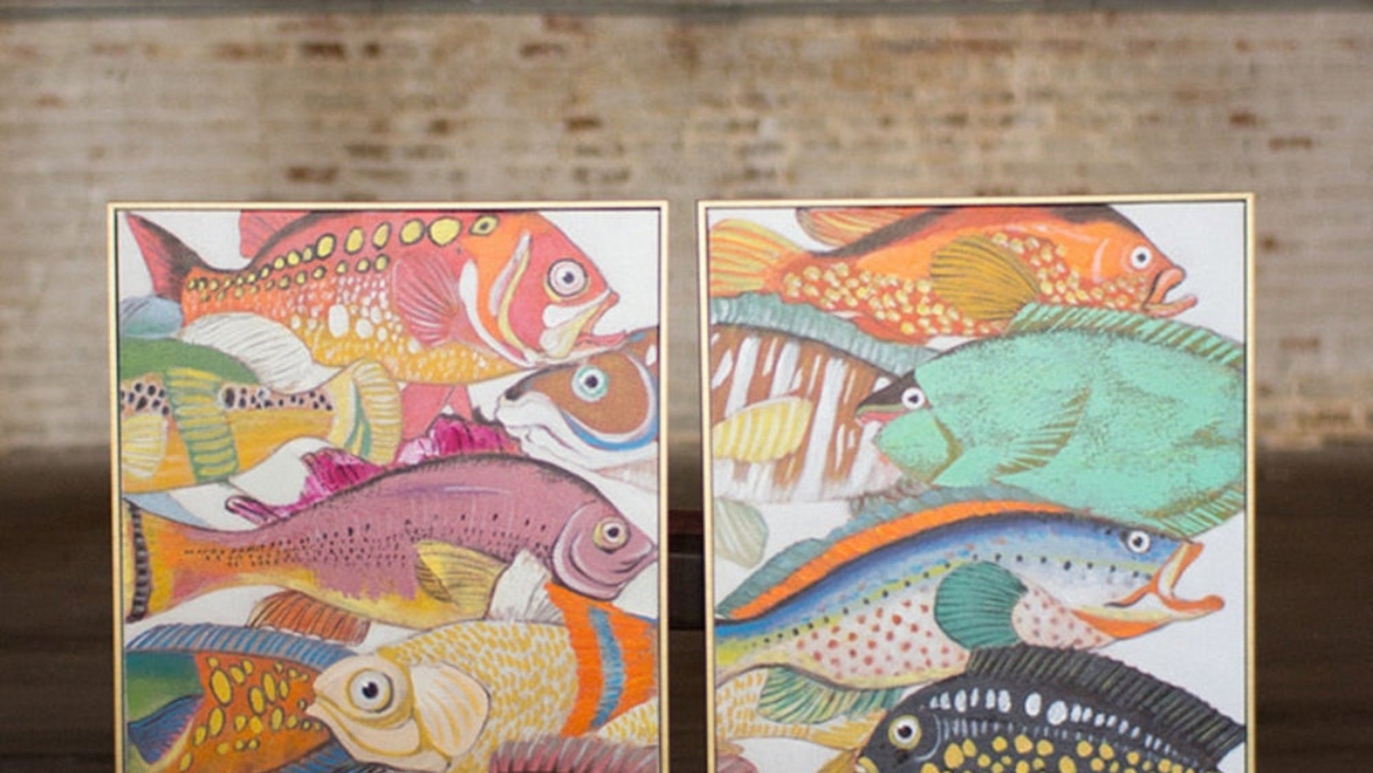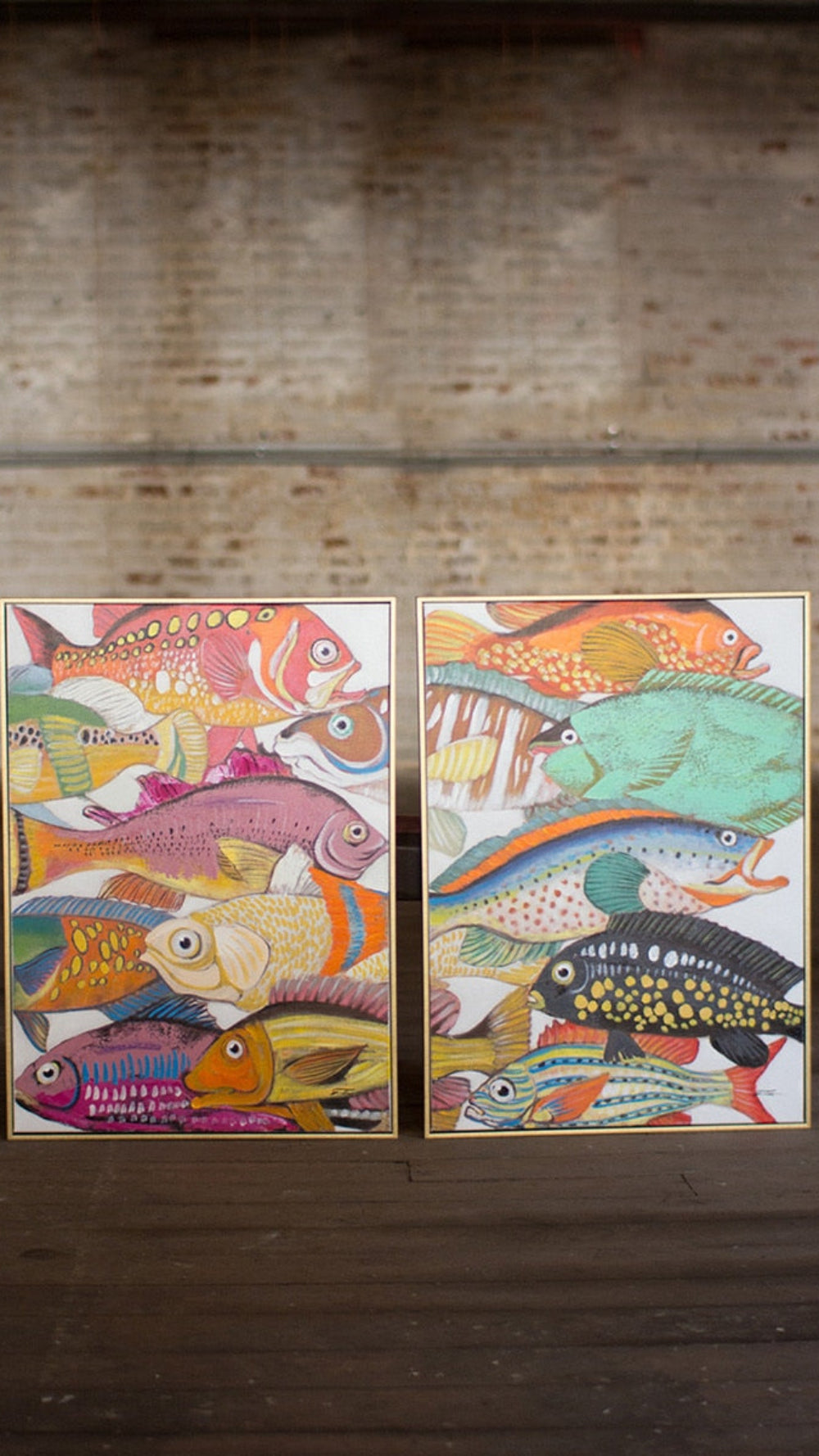 Wall Art – Acrylic Painting Set of Two Fish, Gold Framed Handpainted Canvas by Kalalou