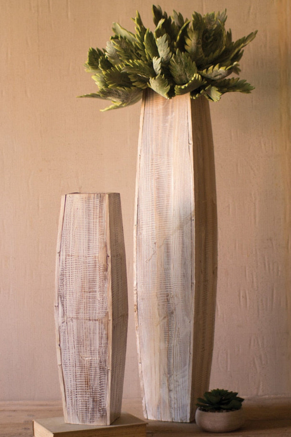 Vase Duo 37"H - White-Washed Tall Wooden Handcrafted Hollow Display Vases (Set of 2) By Kalalou