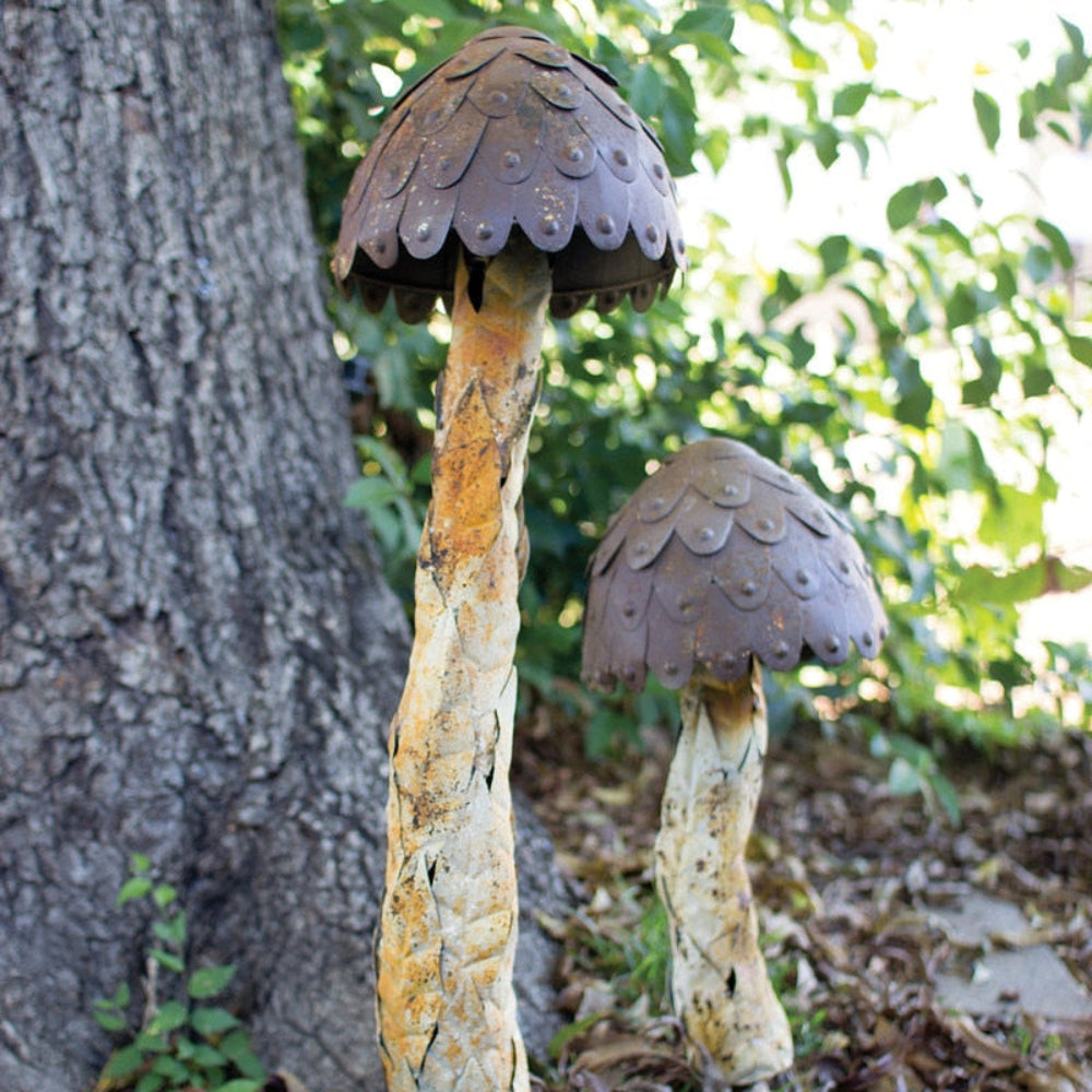 • Set of two rustic mushroom yard stakes crafted from durable metal