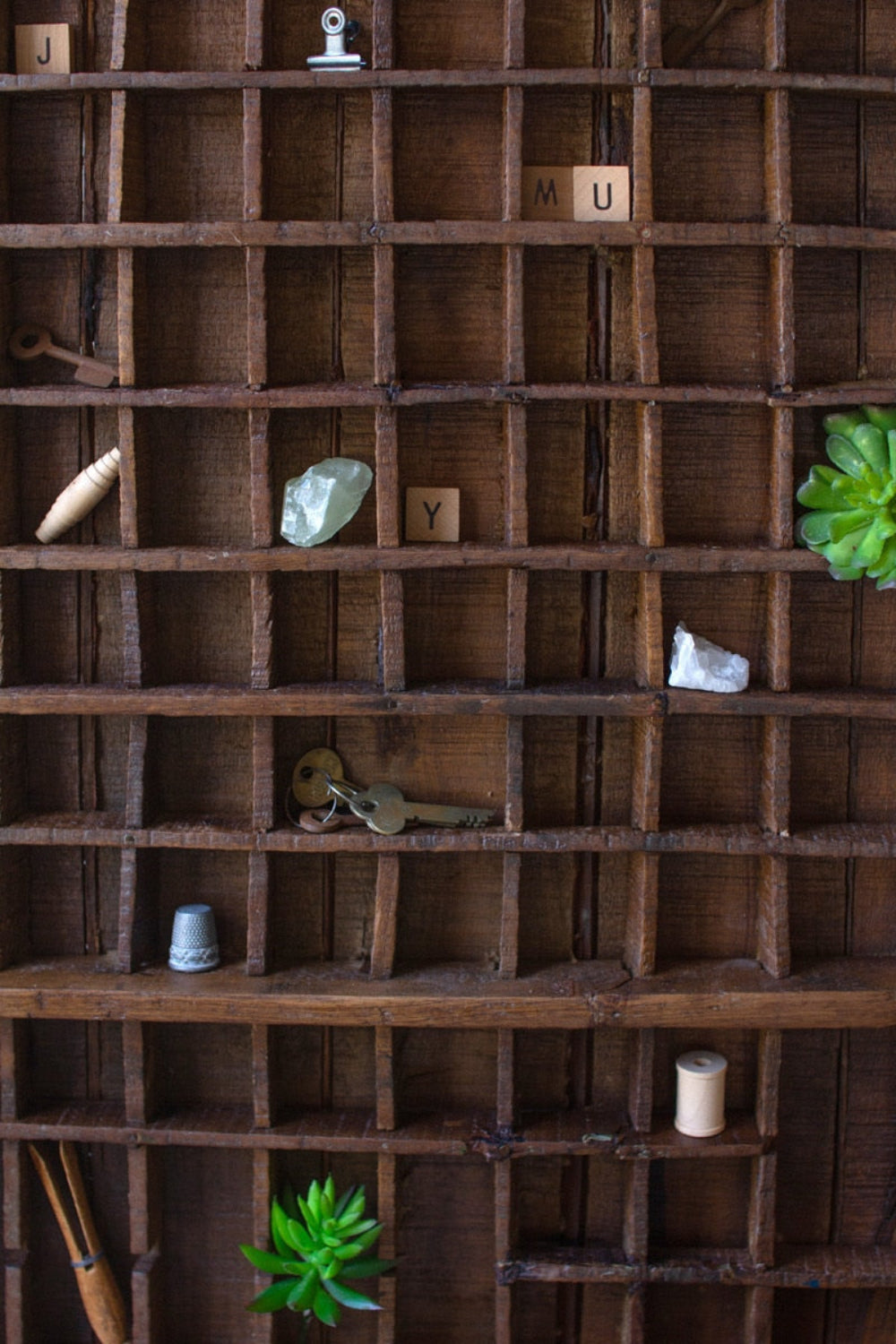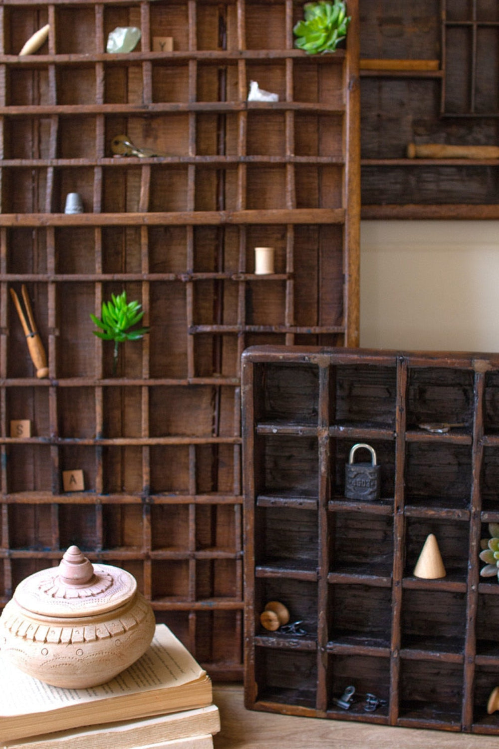 Crafted from recycled wood with a beautifully distressed finish, this tray features an array of small compartments in varying shapes and sizes—perfect for displaying mini collectibles, trinkets, or keepsakes. Designed to hang horizontally using two D-ring hooks, it blends vintage charm with modern character, transforming your wall into a creative gallery of memories and curiosities.