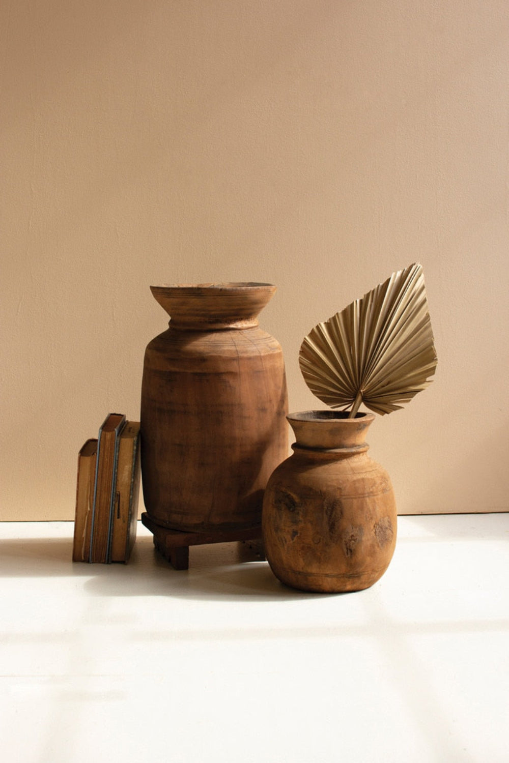 Mango Wood Urns 15"H, Hand-Carved Natural Decorative Vessels, Set of Two by Kalalou
