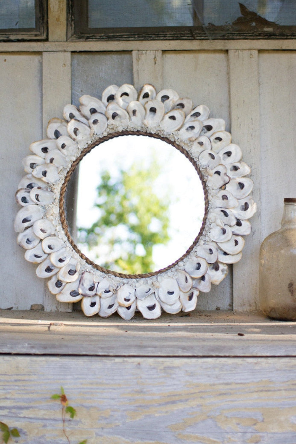 Oyster Shell Mirror, Large Round Oyster 24" Diameter, Handmade Glass & Oyster Shell, White Gloss Finish By Kalalou