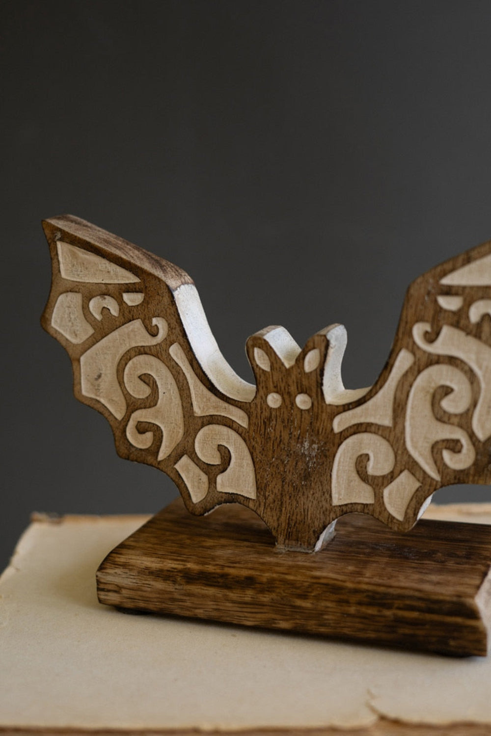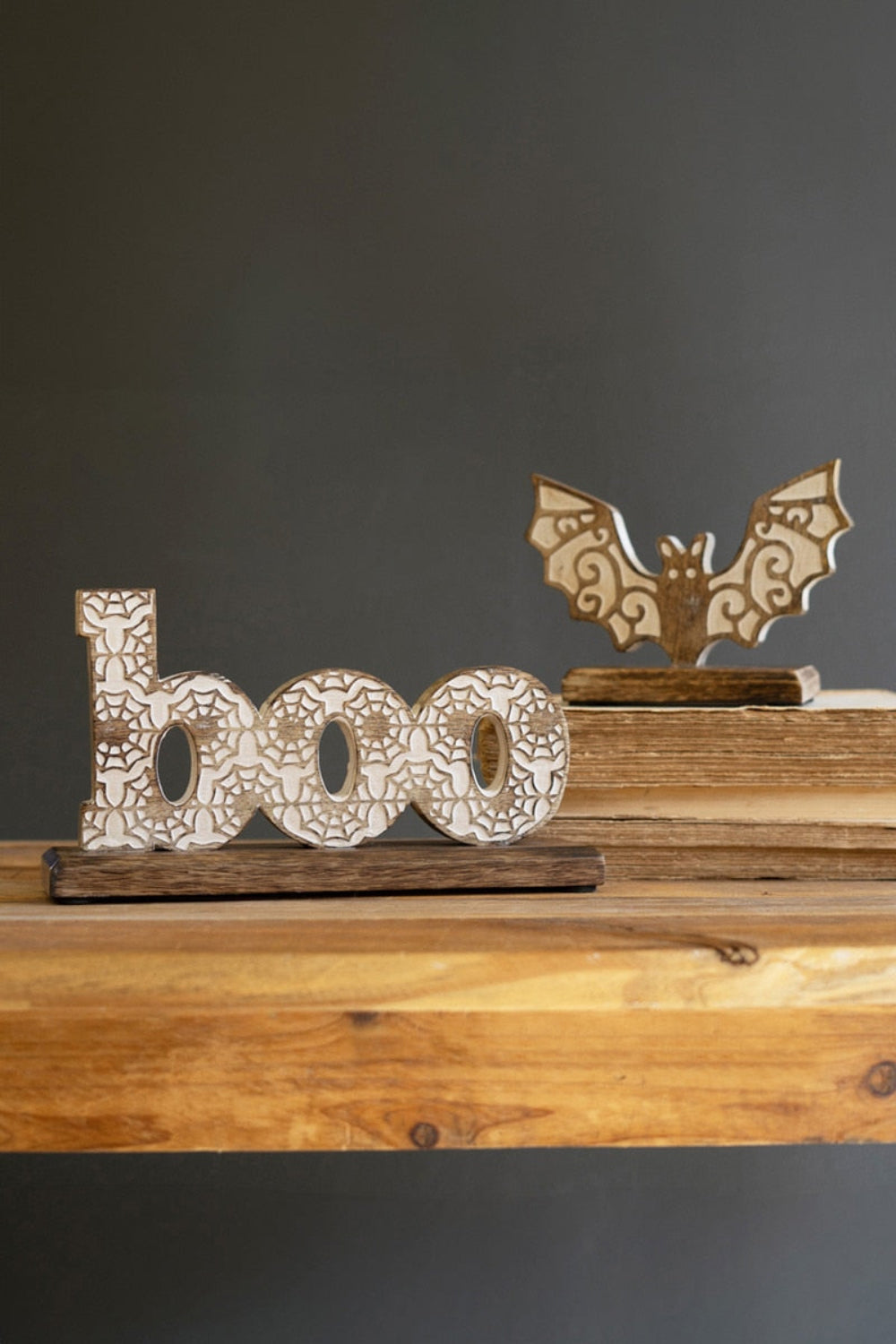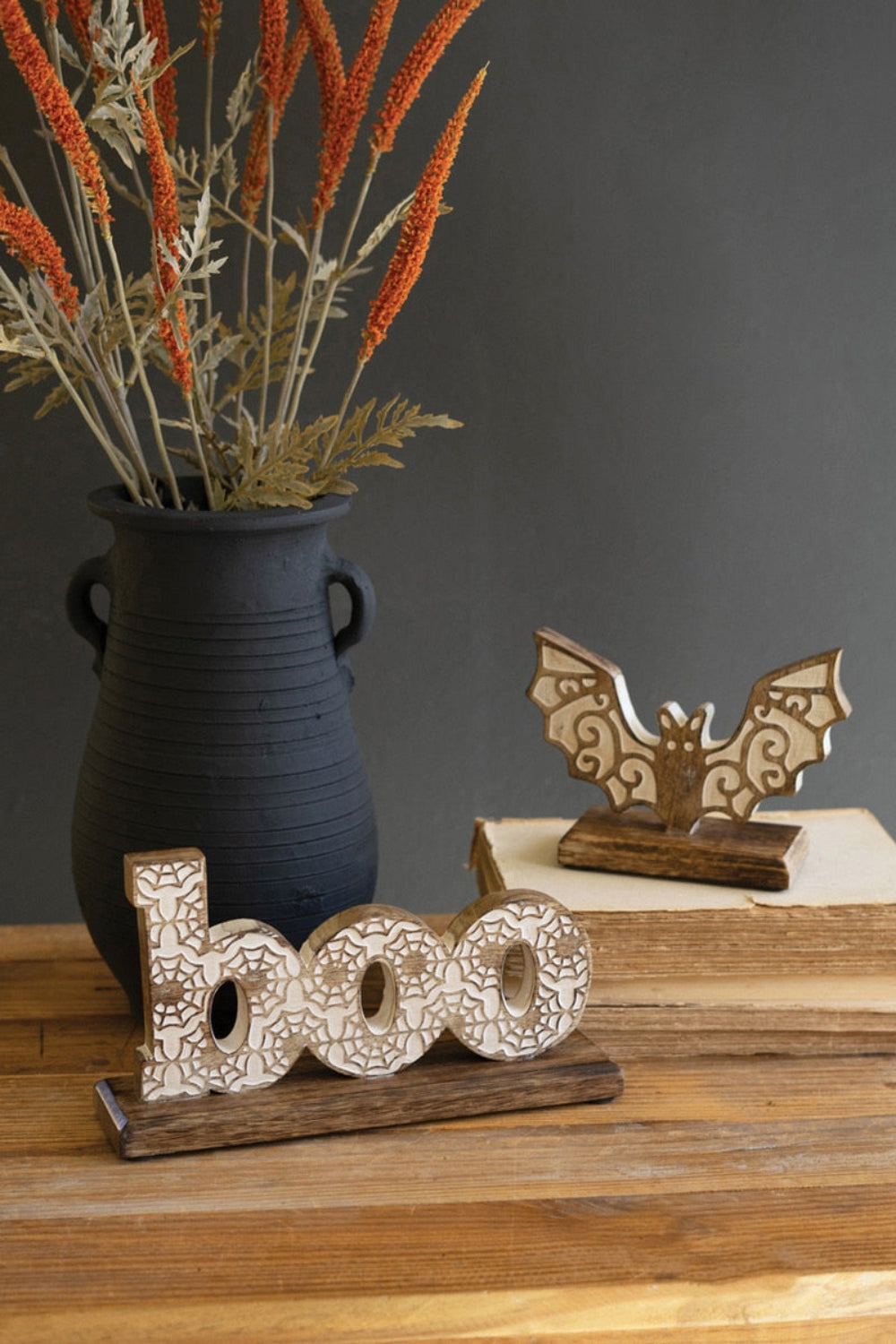 Wooden Halloween Boo and Bat Figurines Set of 2 – 5.25" Height by Kalalou
