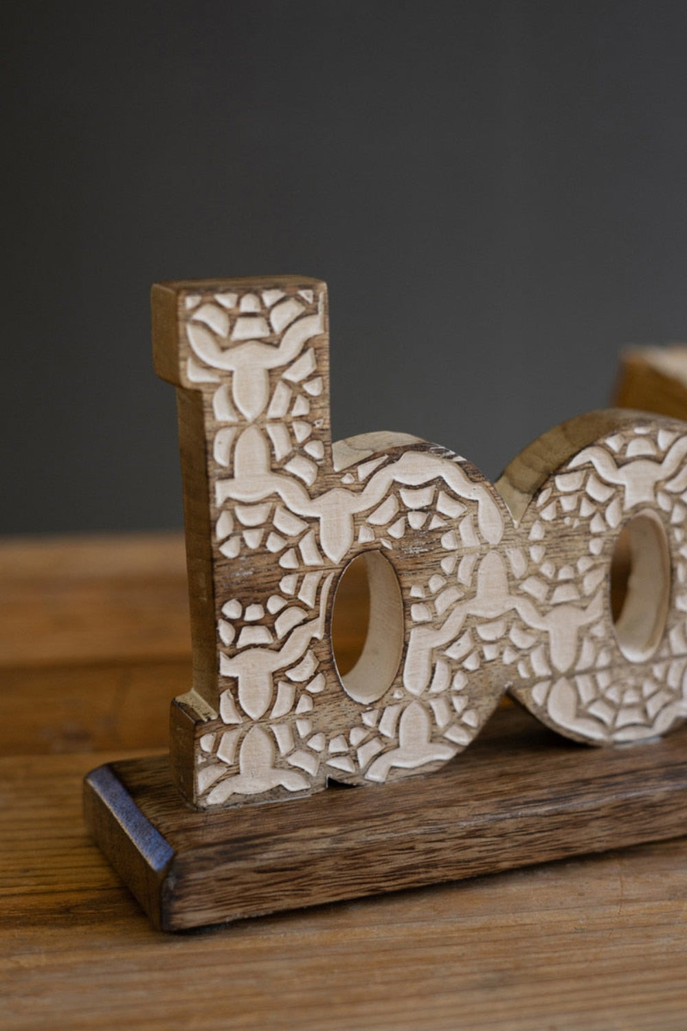 The Set of Two Carved Wooden Halloween Boo and Bat Decorations by Kalalou brings a playful seasonal touch to tabletops, mantels, and entryway displays. Crafted from carved wood with rustic detail, the set includes a “Boo” block measuring 5.25" high and a coordinating bat measuring 5" high, creating a balanced pair for Halloween styling. Their compact size fits easily on shelves or mixed holiday vignettes, adding charm without overwhelming the space. These sturdy wooden pieces offer timeless appeal and can be used year after year.Dimensions: Boo 10" L × 2.5" W × 5.25" H; Bat 7" L × 2.5" W × 5" H.