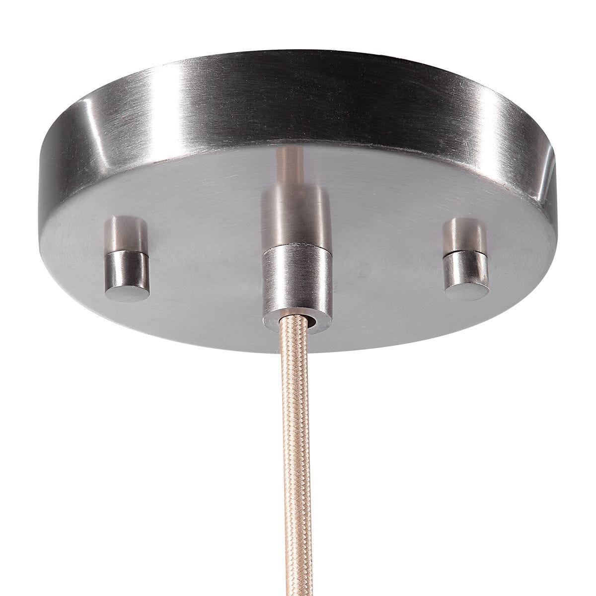 Crafted with durable steel and glass, the fixture is accented by a brushed nickel finish and includes a 15-foot beige fabric cord for adjustable hanging. Measuring 10"H x 9"Dia, it’s ideal for kitchens, dining spaces, or entryways.