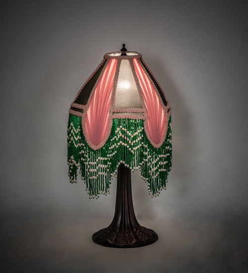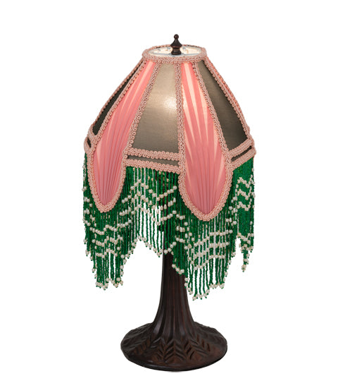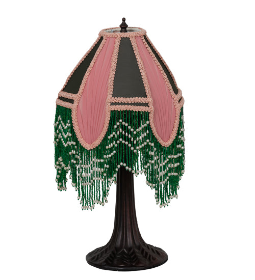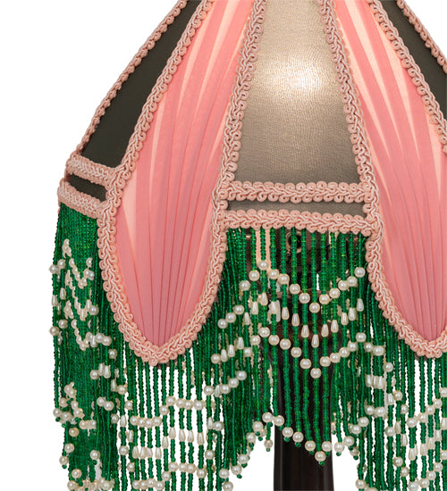 This Victorian inspired shade adds a touch of elegance to your darkest night. An exquisite Gray Fabric design is accented with soft Pink Pleated Panels and color coordinated trim. This handmade fabric shade is enhanced with Green and White beaded glass fringe trim which is knotted across a gracefully curving form. This beautifully detailed lamp base is designed in a warm Mahogany Bronze. UL and cUL listed for dry locations