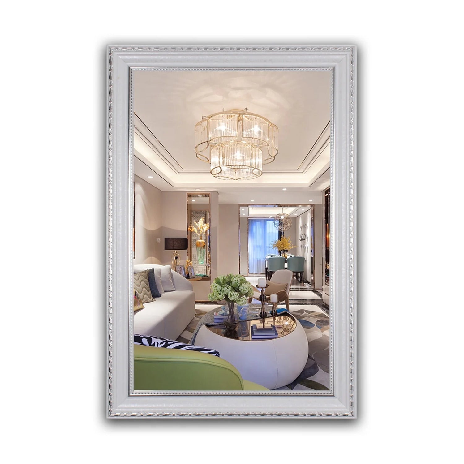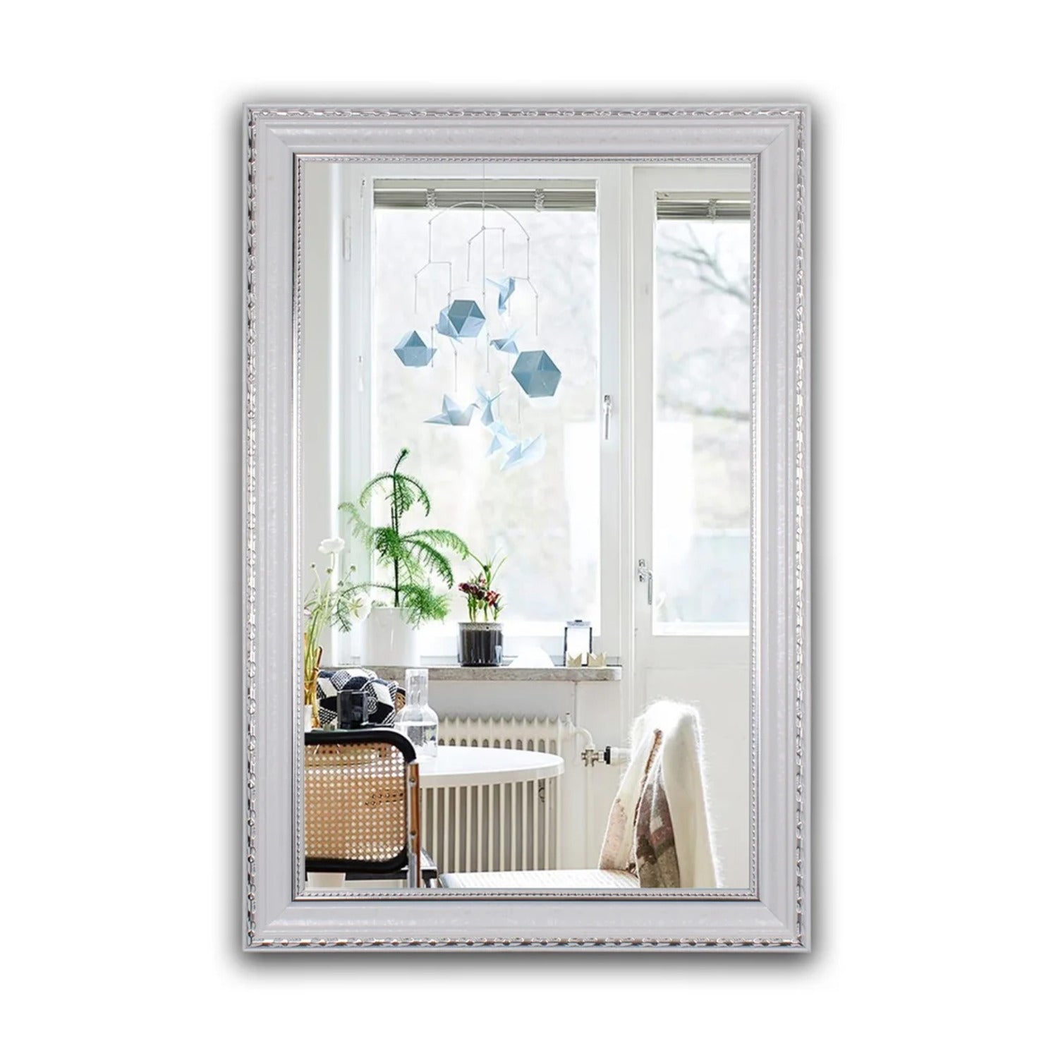Looking for a modern touch for your home? This rectangle framed wall mirror is just the piece you`ve been searching for! This mirror has a white finish, can hang both horizontally and vertically, and will look great in the bathroom and as a vanity for a makeup stand! The mirror is damp listed for use in a restroom, but is nor recommended for use outdoors.