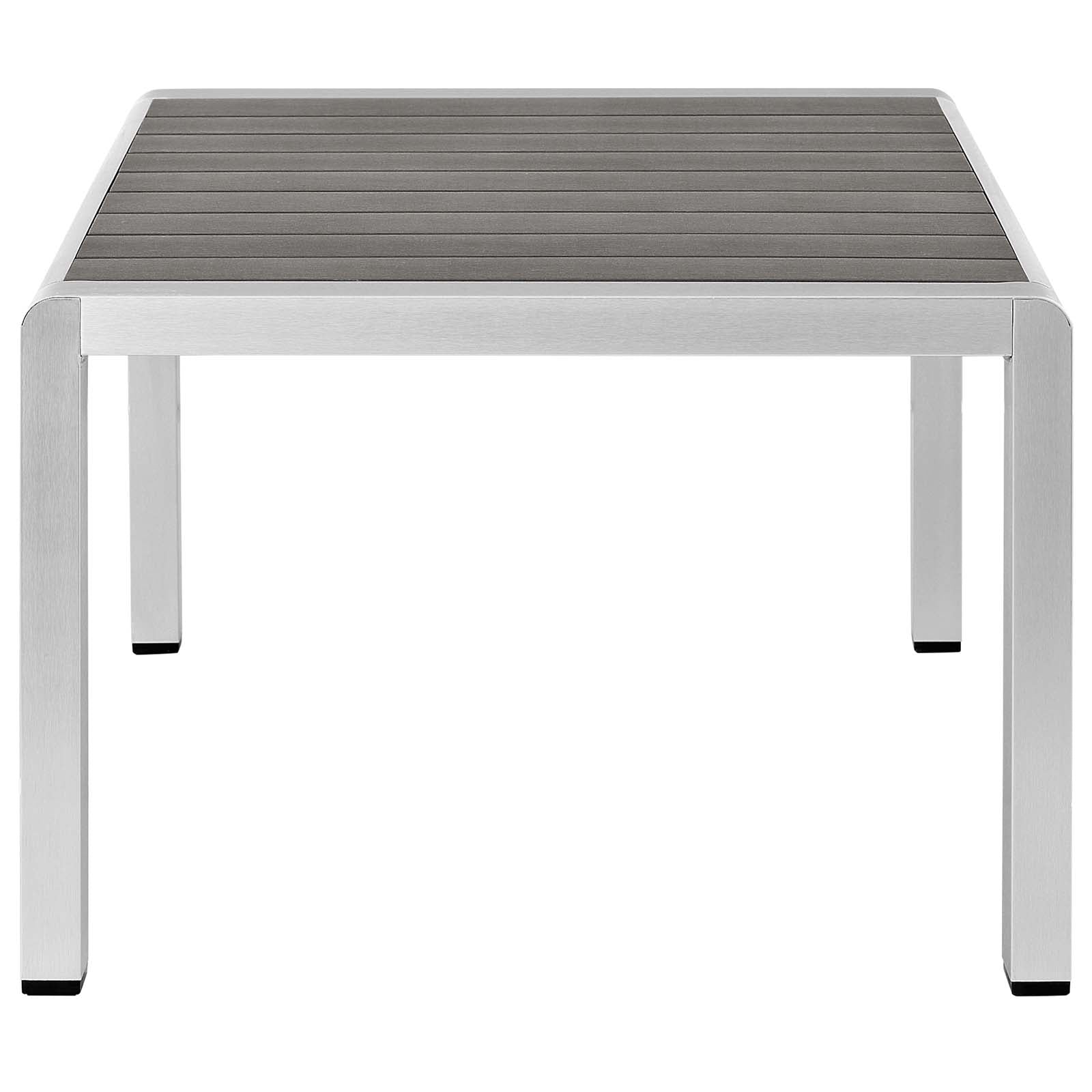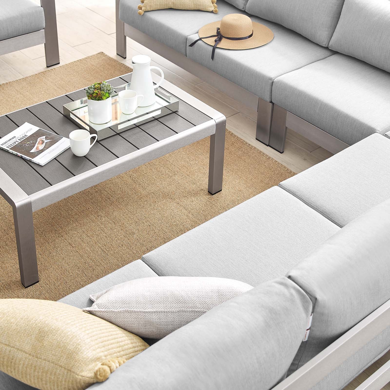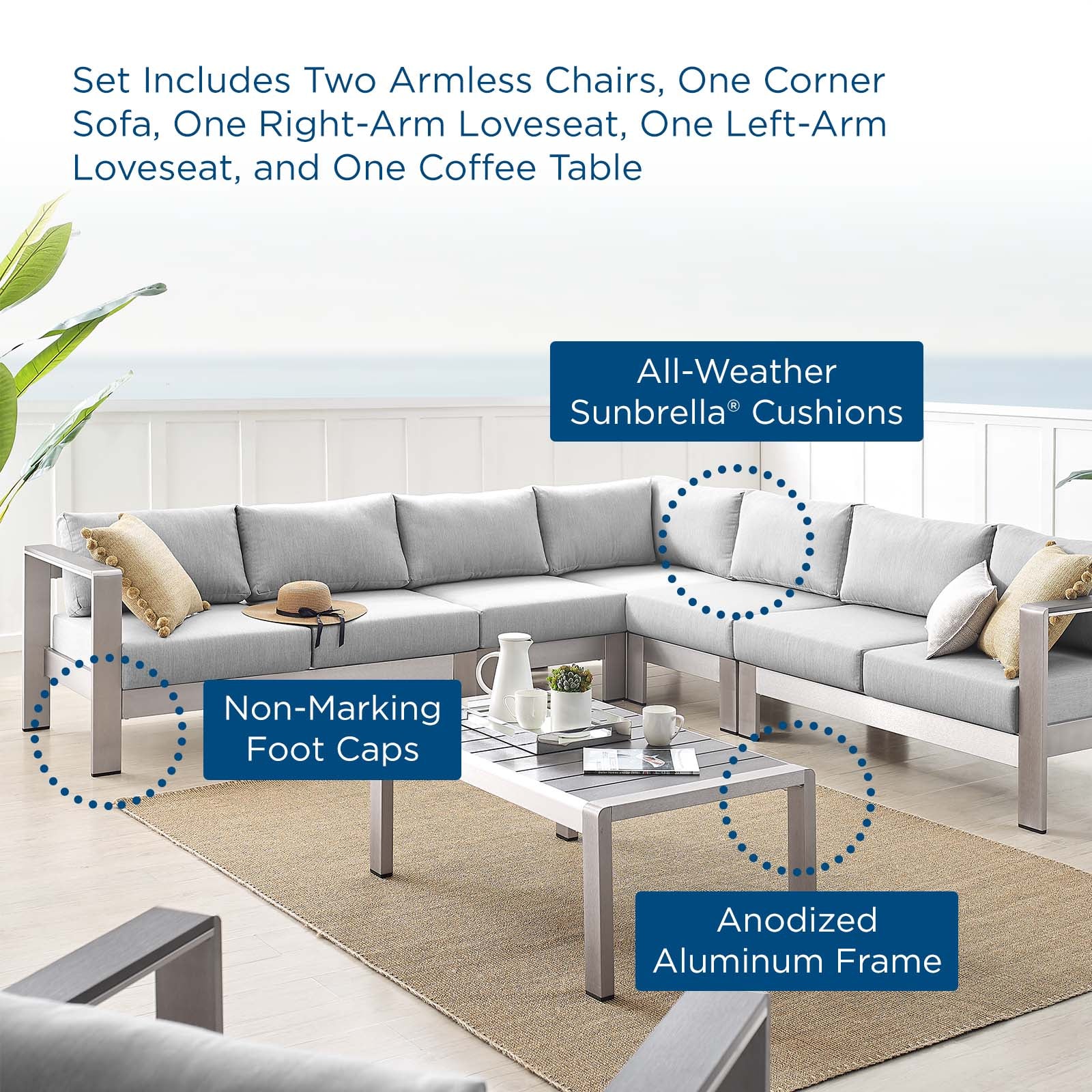 Enjoy your patio or backyard leisure time with the strong and durable Shore Outdoor Patio Aluminum 6 Piece Sectional Sofa Set. Made with anodized brushed aluminum frames and non-marking black plastic foot caps, Shore comes outfitted with resilient Sunbrella fabric canvas cushions tested to last through all weather conditions. The Shore Outdoor Sectional Sofa Set complements your casual gatherings with a look and functionality you can rely on. Set Includes: 1 Left-Arm Sofa, 1 Right-Arm Sofa, 1 Corner Chair, 2 Armless Chairs, 1 Coffee Table Set Includes: One - Shore Coffee Table One - Shore Corner Sofa One - Shore Left-Arm Loveseat One - Shore Right-Arm Loveseat Two - Shore Armless Chair