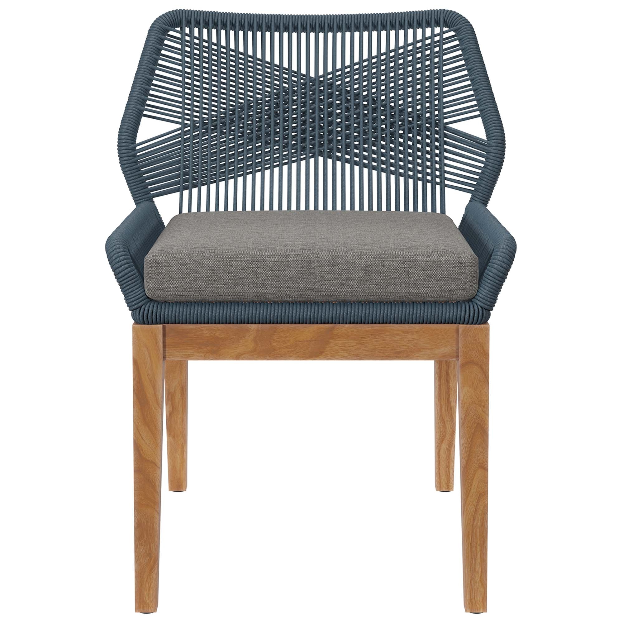Relax amidst friends and family as you enjoy a meal al fresco with the Wellspring Outdoor Patio Dining Chair. Wellspring brings contemporary modern aesthetics to a backyard, porch, patio, or poolside with it's calming colors, organic wood grain, woven rope detail on the aluminum seat frame, and a crisscross pattern along the backrest. Featuring a premium solid teak wood base with stretchers and non-marking foot pins to protect flooring, this patio chair stool boasts a removable cushion with dense foam padding and ties to ensure a secure seat. It's versatile design makes it a stylish addition indoors too. Assembly required. Weight Capacity: 220 lbs.