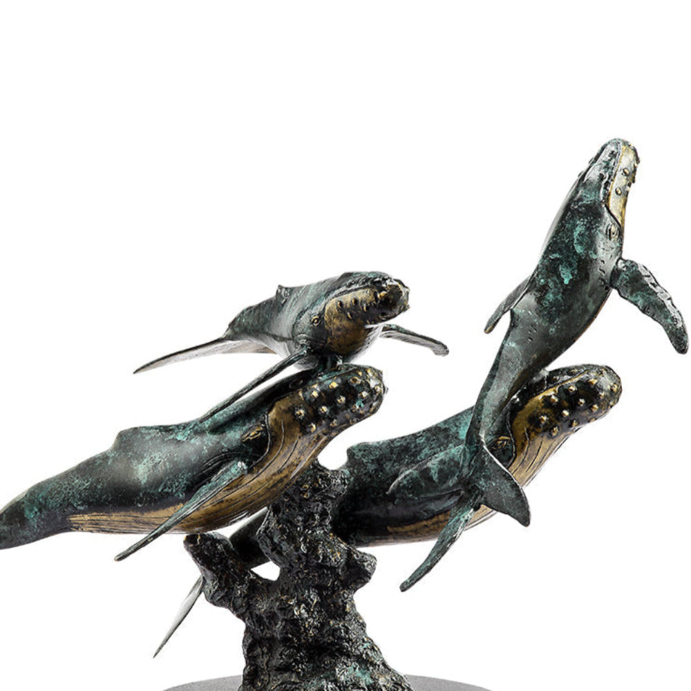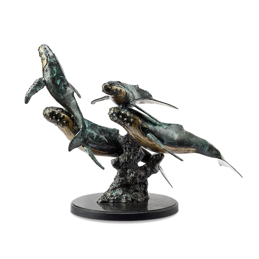 SKU - SPI51084Humpback Quartet Sculpture – Brass Ocean-Inspired Marine Life Decor, 18" Tall Whale Family Display