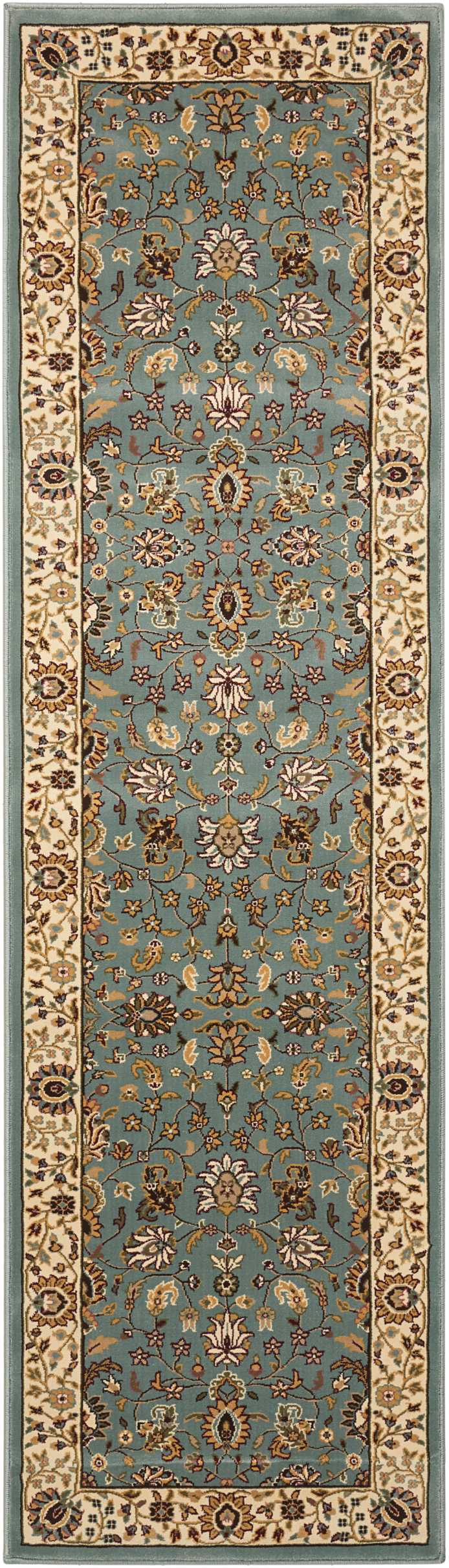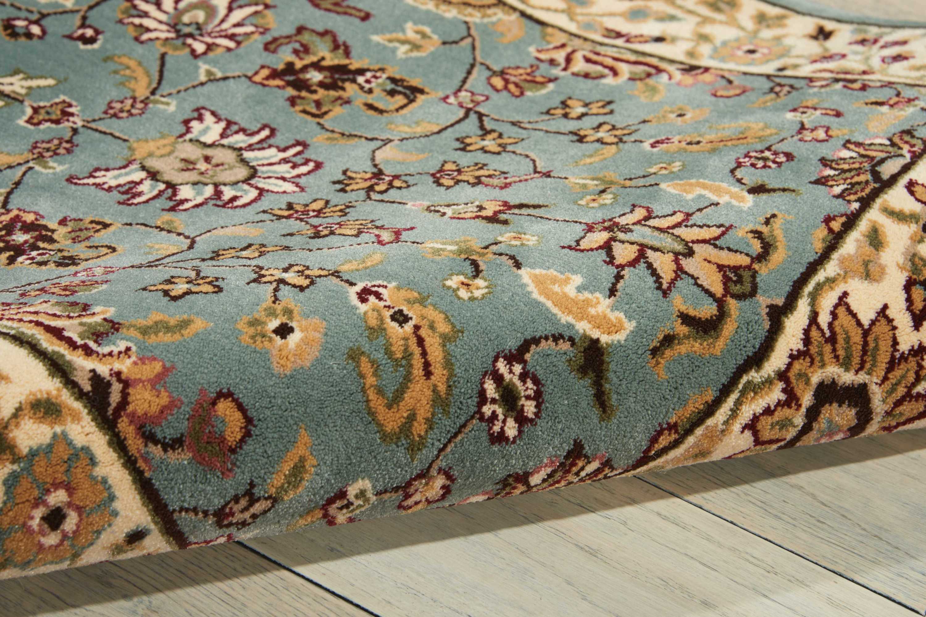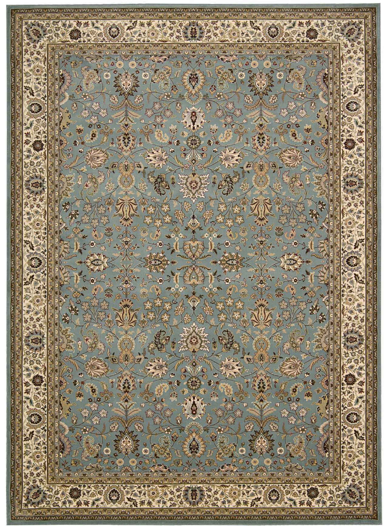 A perfect slate blue creates irresistible beauty as the background for a charming display of ancient Persian floral motifs. Framed by an elegant border in gently contrasting ivory, this special rug feels as silky as it looks. Beautifully detailed with accents in sage and garnet.