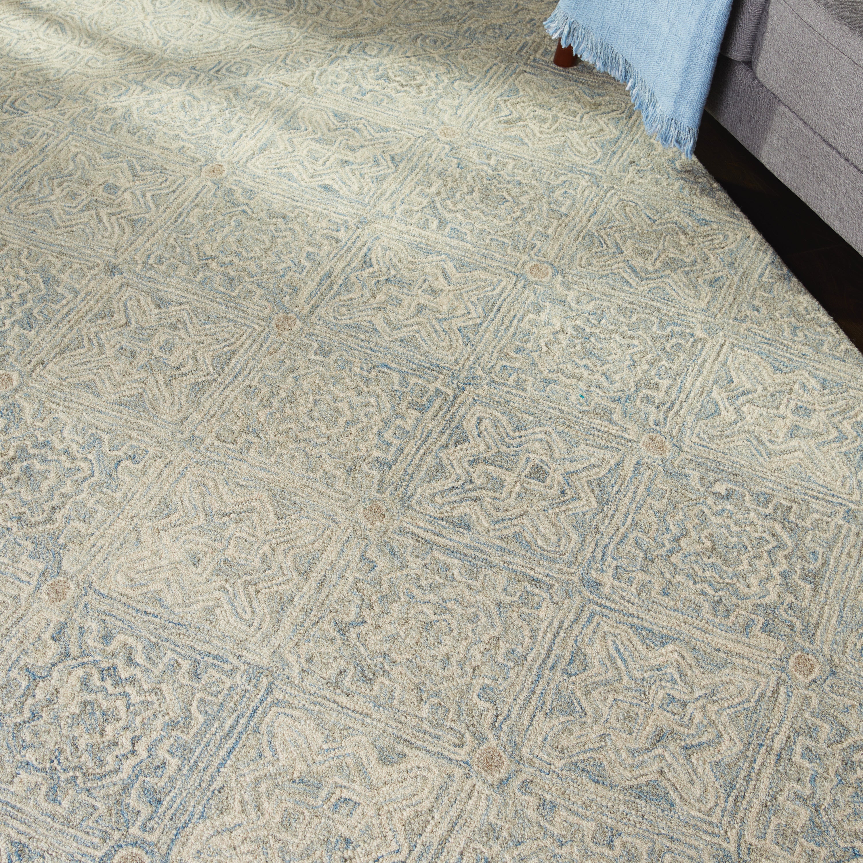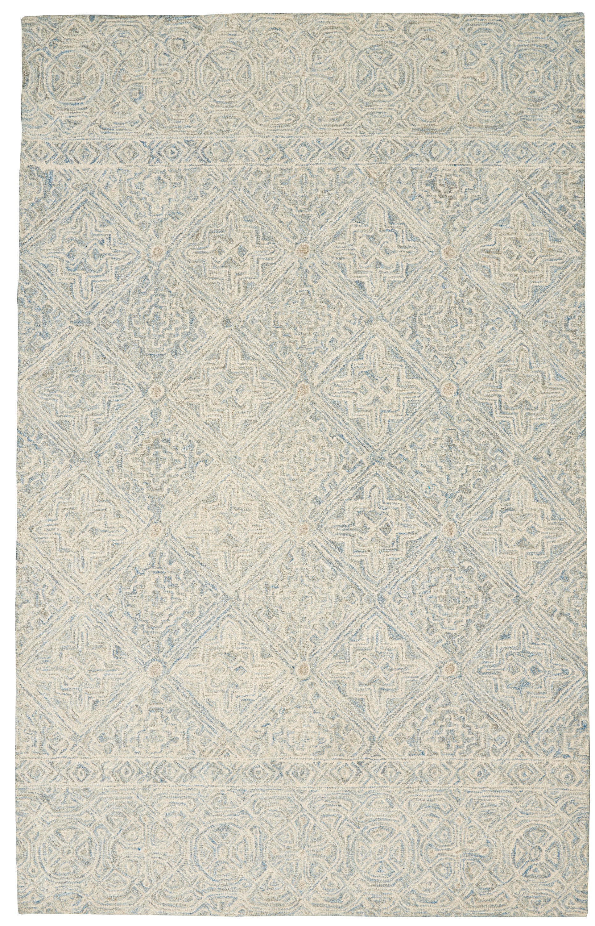- Dense tribal patterns in light blue and white