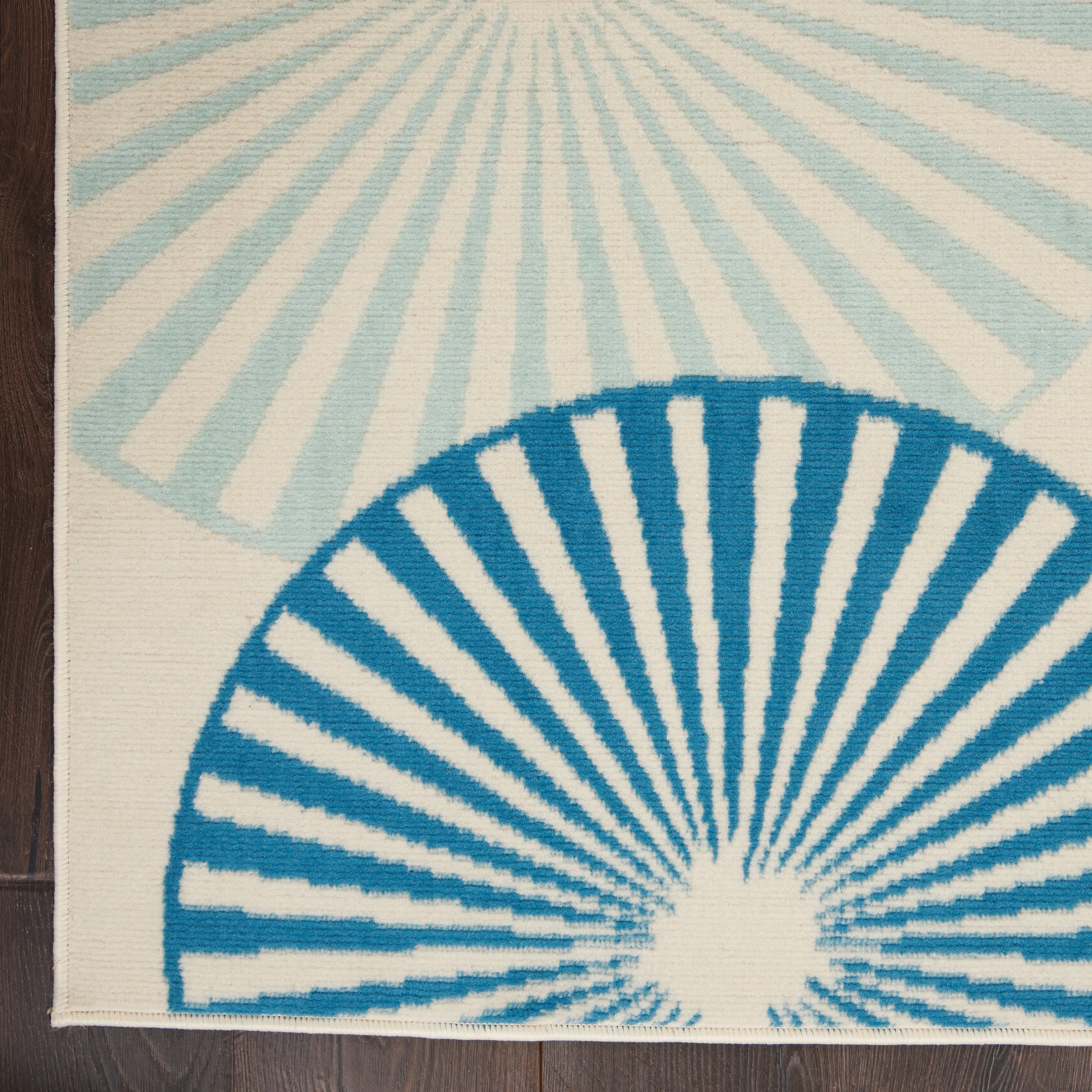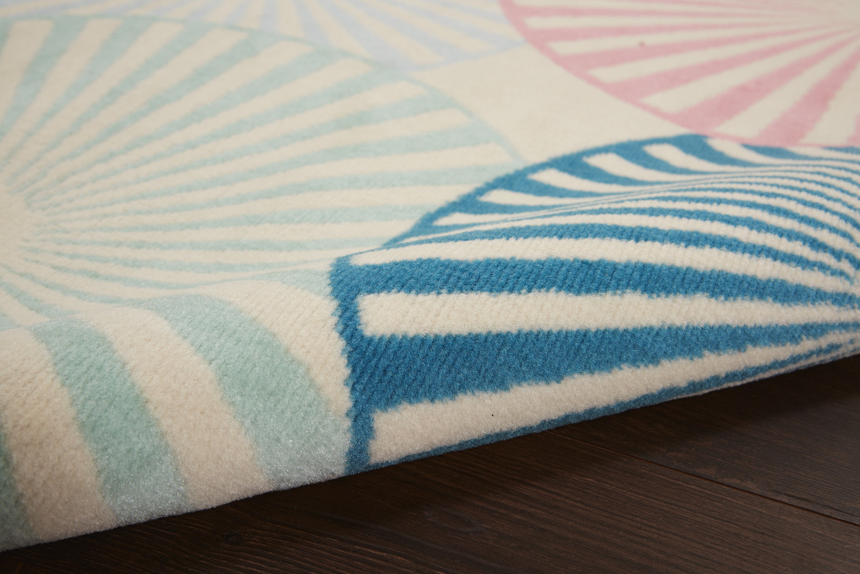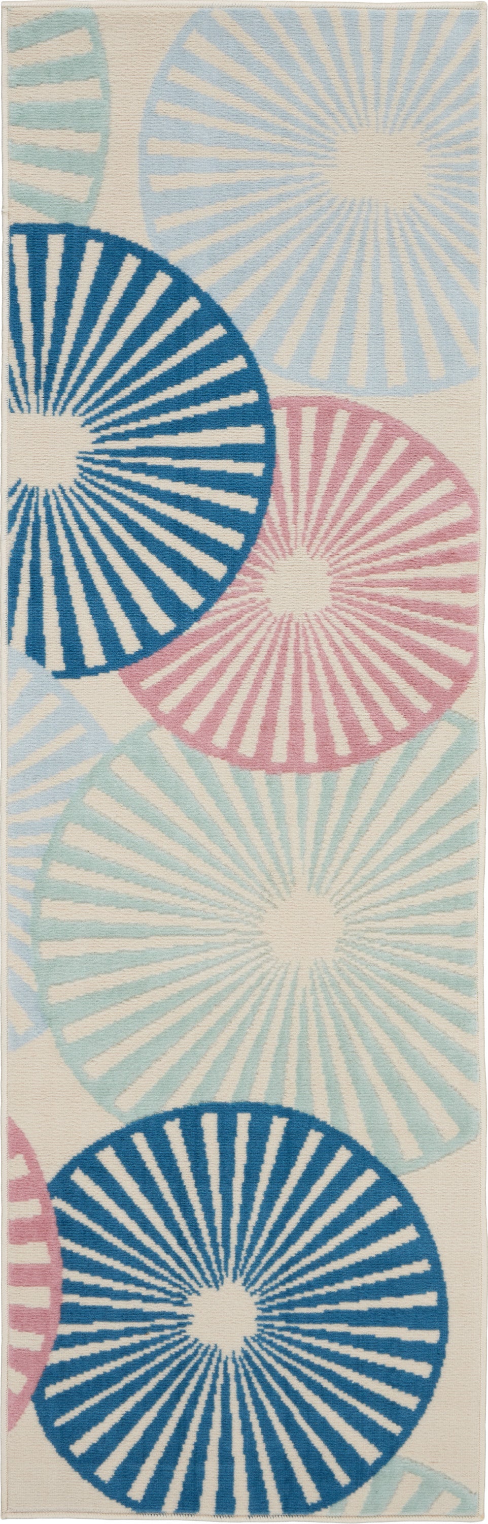 An array of overlapping orbs create captivating energy and vibrance in this Grafix area rug. Radiating circular patterns in soft blue, white, and pink adorn an ivory field in a burst of contemporary flair.