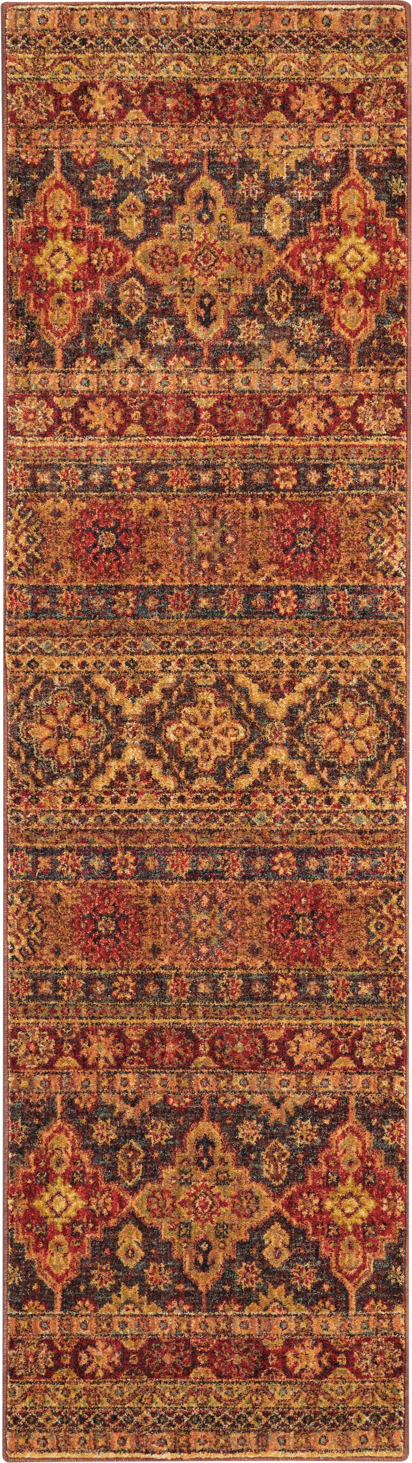 This Jewel Collection rug exudes antique Oriental rug allure, with ornate bands of intricately detailed Persian patterns, in traditional shades of red, gold, slate, and beige. The low pile`s sheen and subtle texture brings the look and feel of a vintage antique rug to your home.