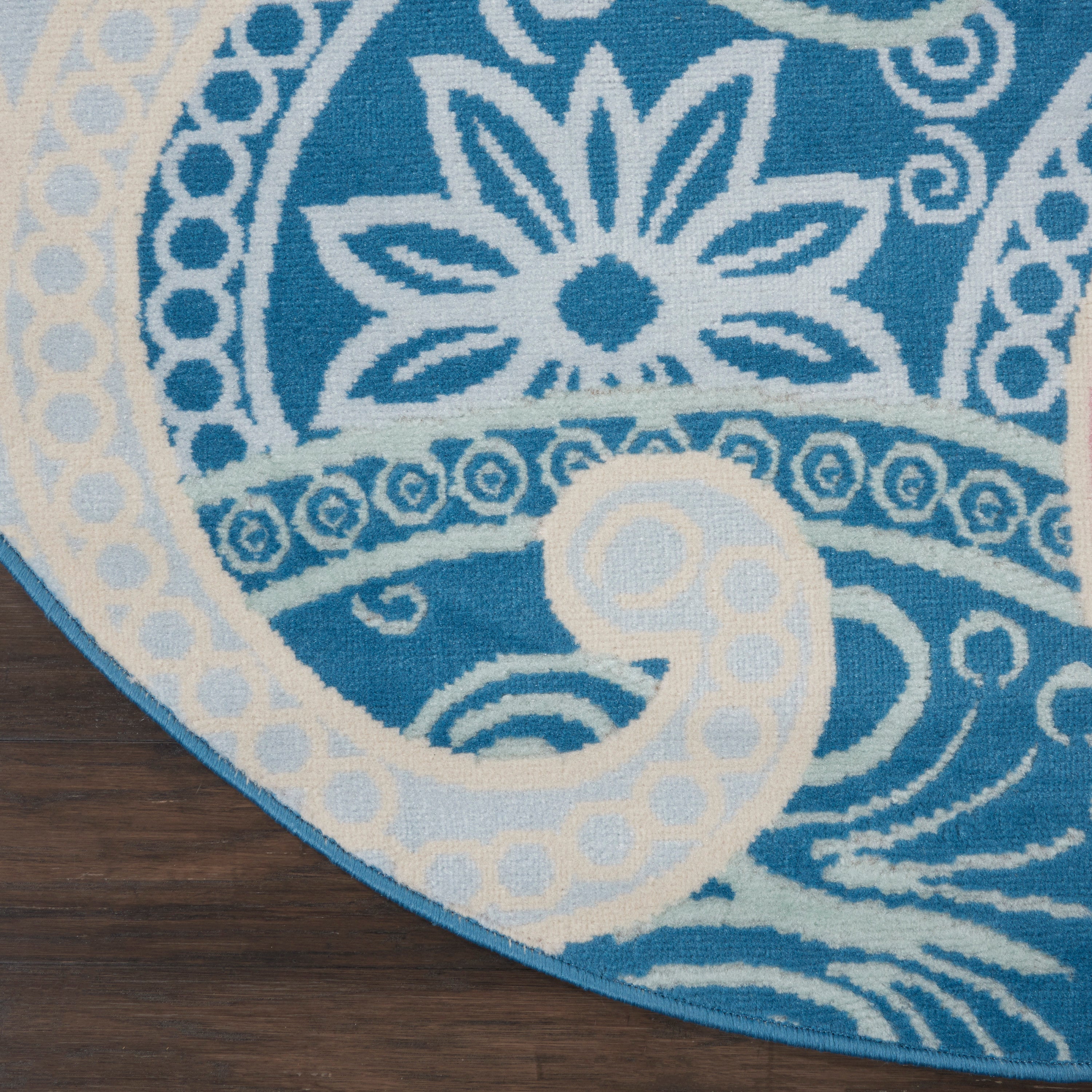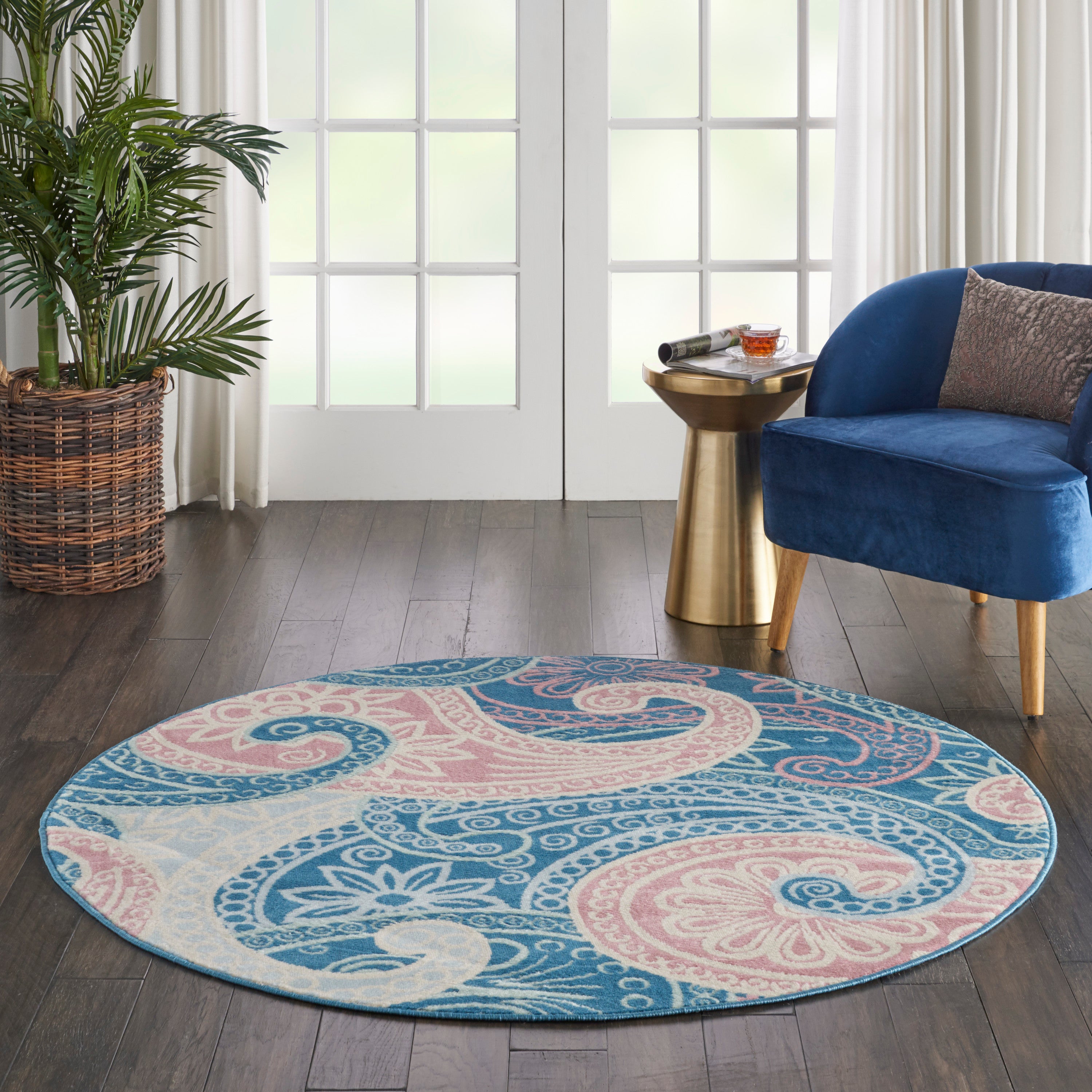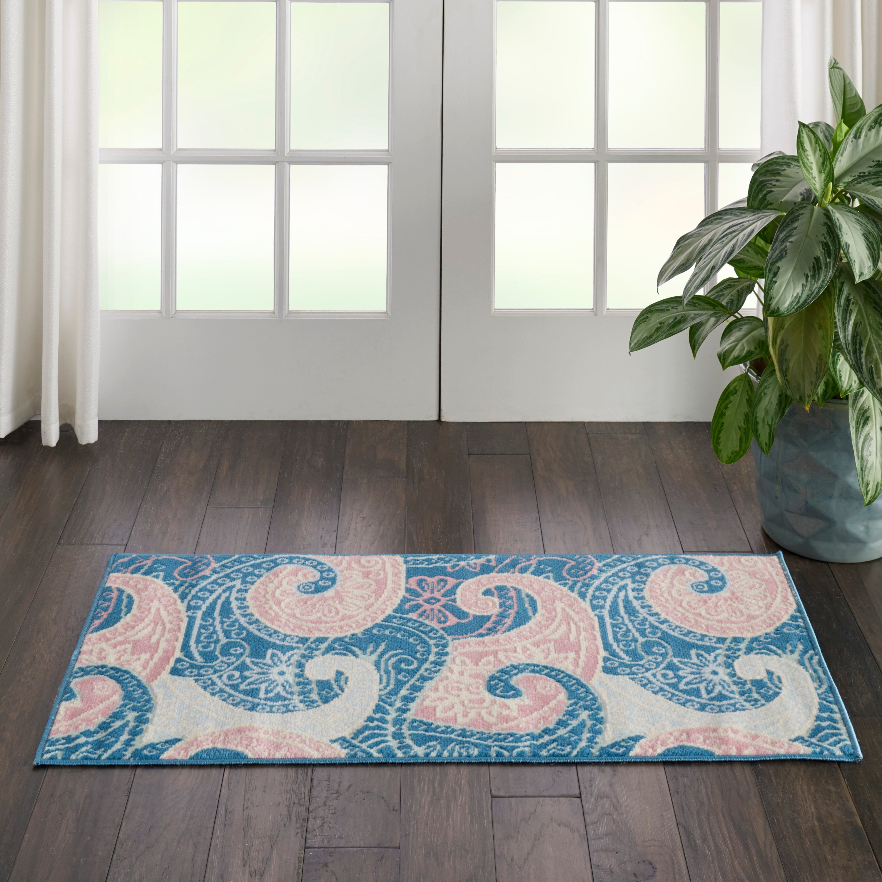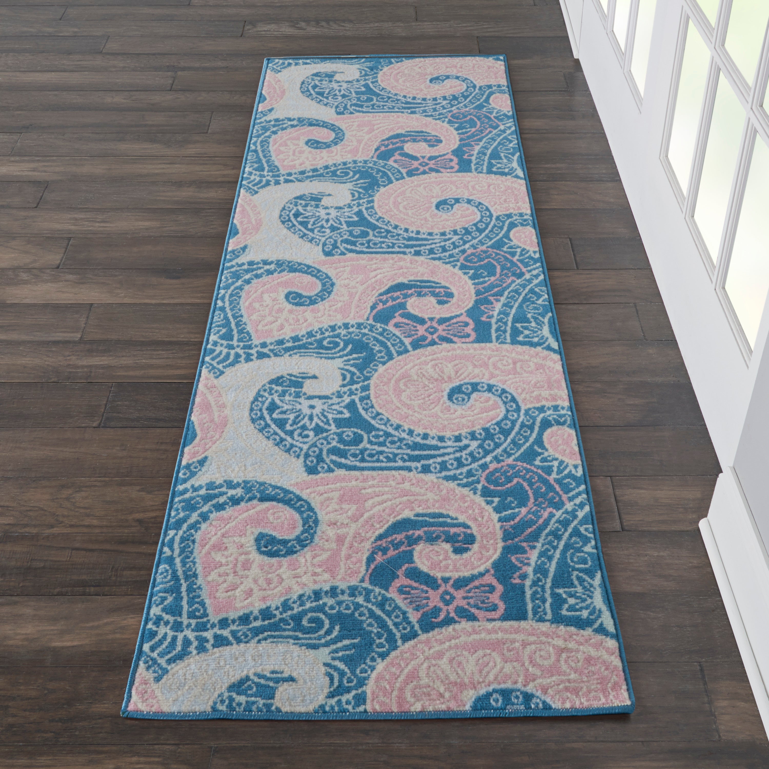 Paisley goes playful in this contemporary area rug with boho appeal, with a combination of oversized designs and softer tones of pink, ivory, and blue. Introduce a retro style to any space, with low-pile easy-care fibers.
