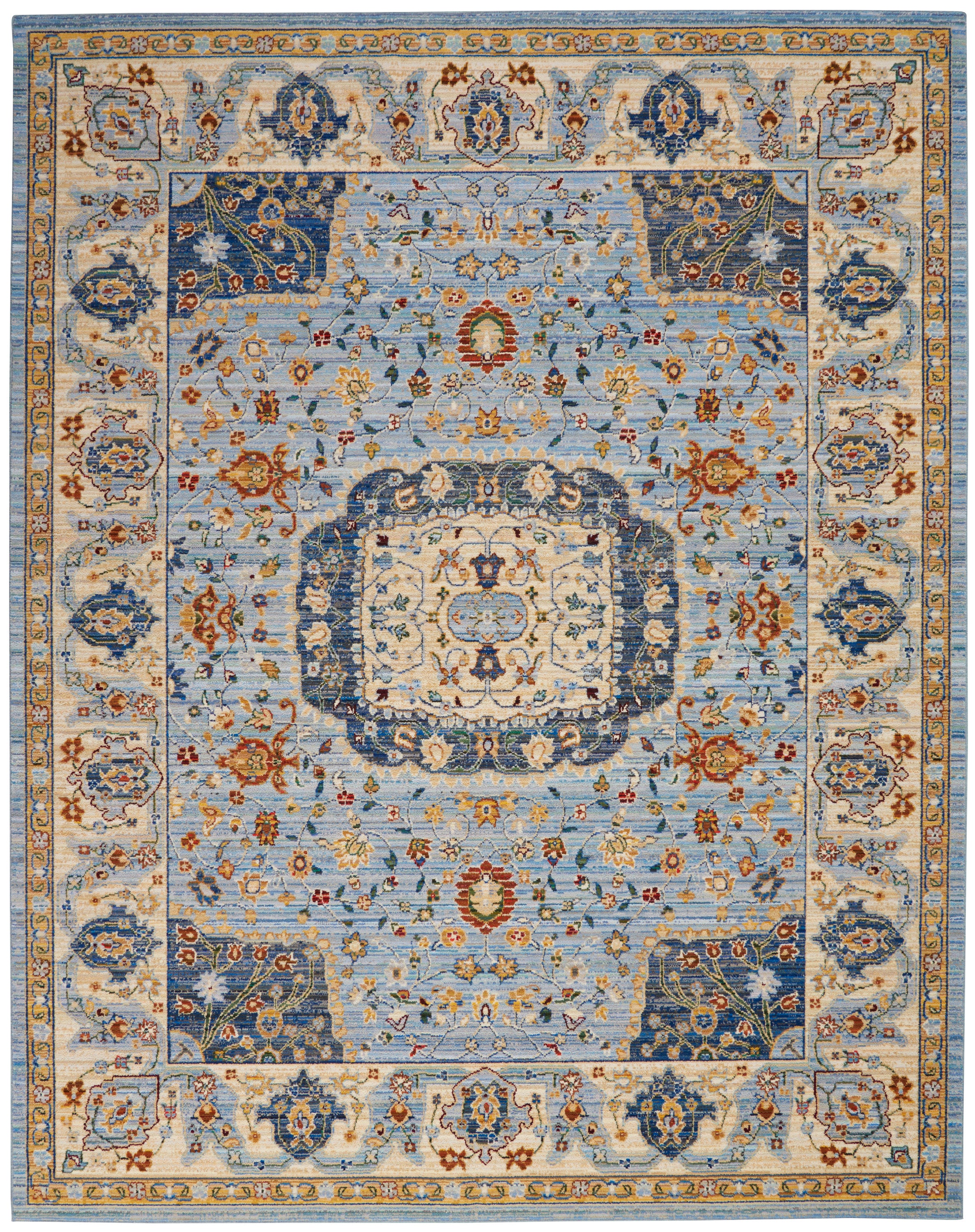 This elegant bordered rug features graceful vine-and-bloom patterns on a pale abrash blue field, with an ornamental border and medallion reflecting exquisite Persian rug design. Thick, luxurious cut pile from wool and nylon create the look and feel of a vintage rug that will bring elegance and excitement to any room in the home.